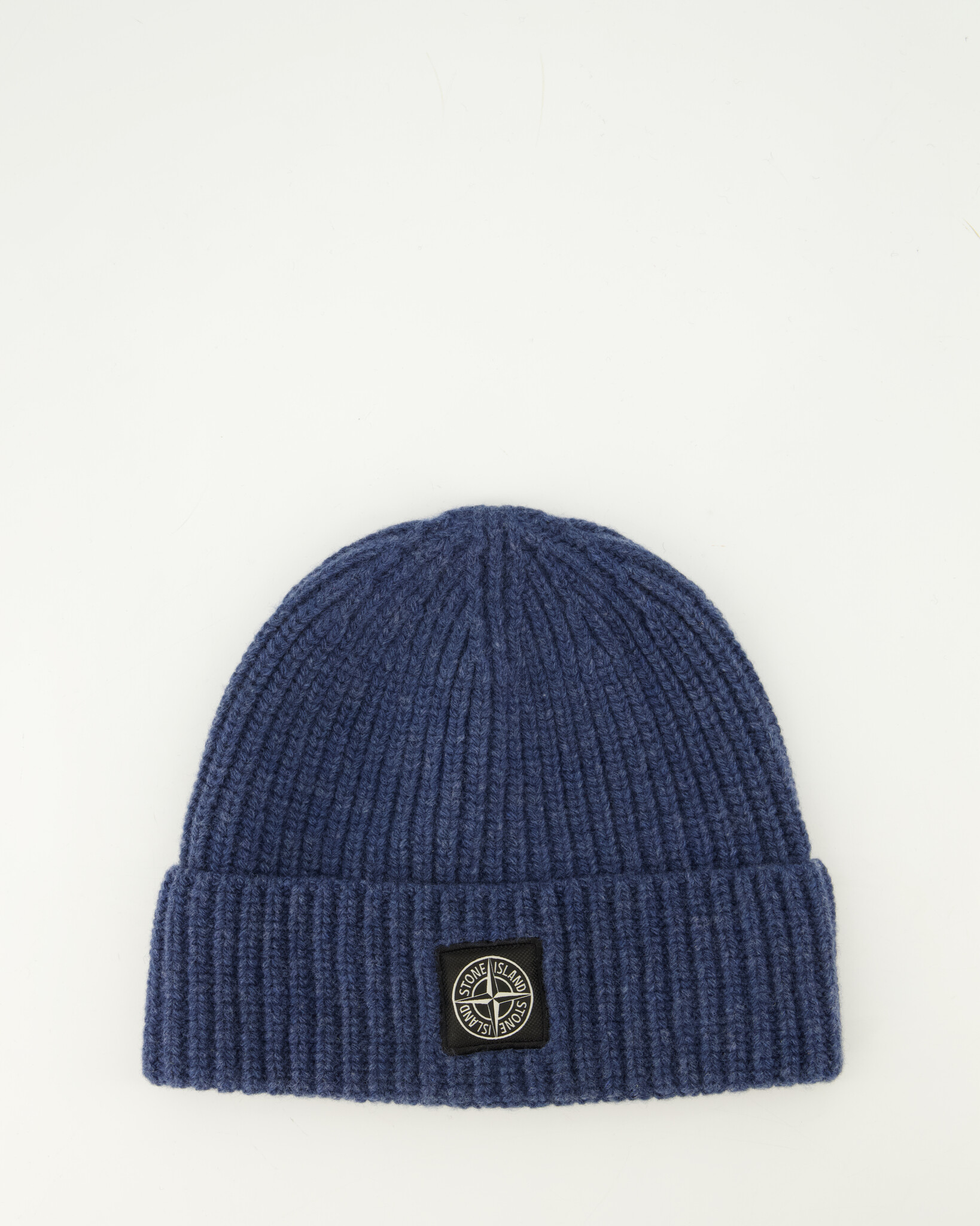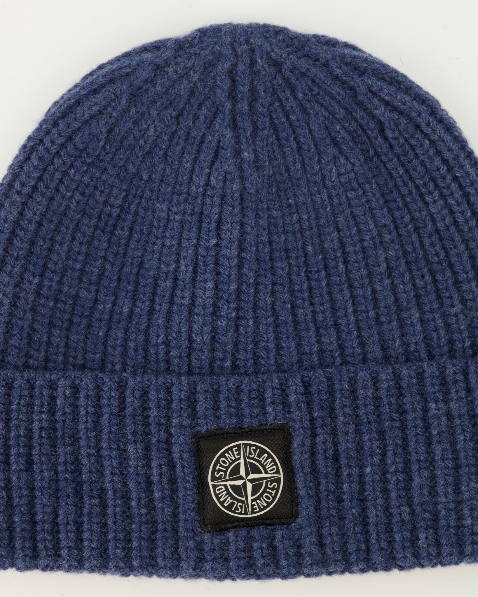 Blauwe 5N100012 Beanie van het merk Stone Island. De beanie heeft op de voorkant het bekende stone island logo.