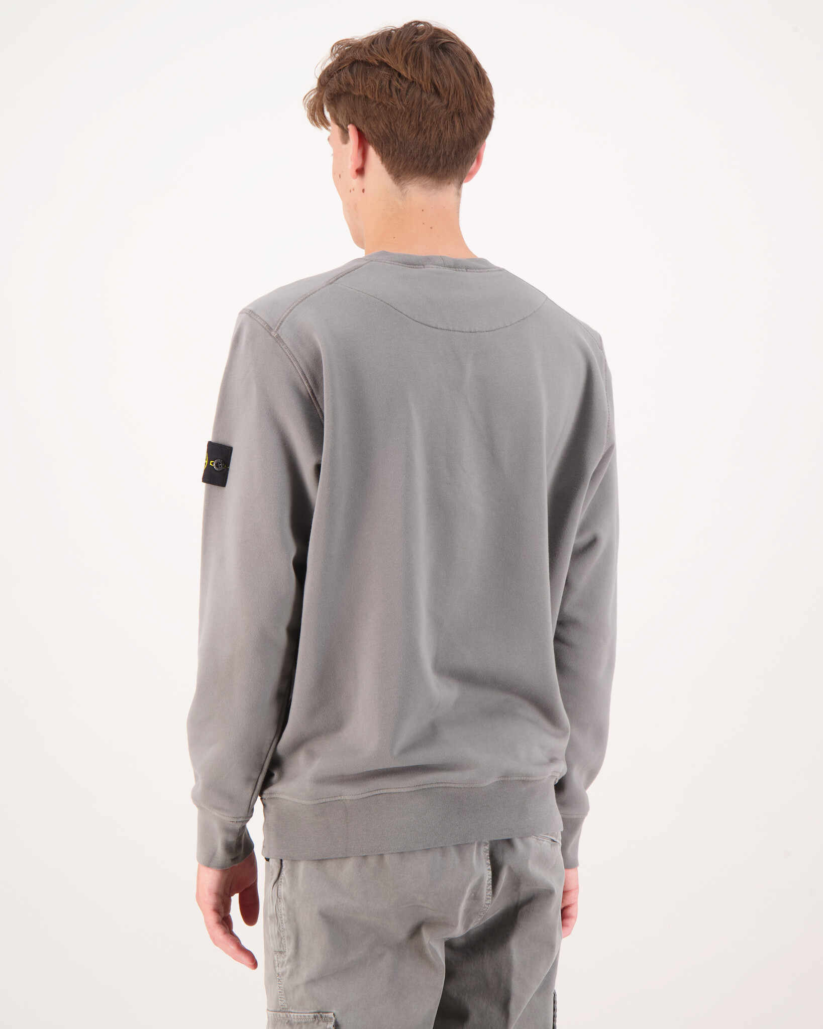 Grijze 6100060 Organic Cotton Fleece Sweater van het merk Stone Island. Sweater met ronde hals van fleece van biologisch katoen, met overlocknaden, een lunette met binnenvoering en elastische geribde boorden. Kledingstuk geverfd.