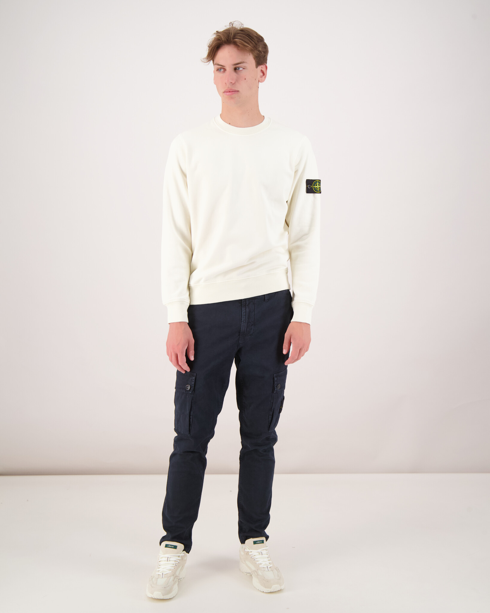 Ivoor 6100060 Organic Cotton Fleece Sweater van het merk Stone Island. Sweater met ronde hals van fleece van biologisch katoen, met overlocknaden, een lunette met binnenvoering en elastische geribde boorden. Kledingstuk geverfd.