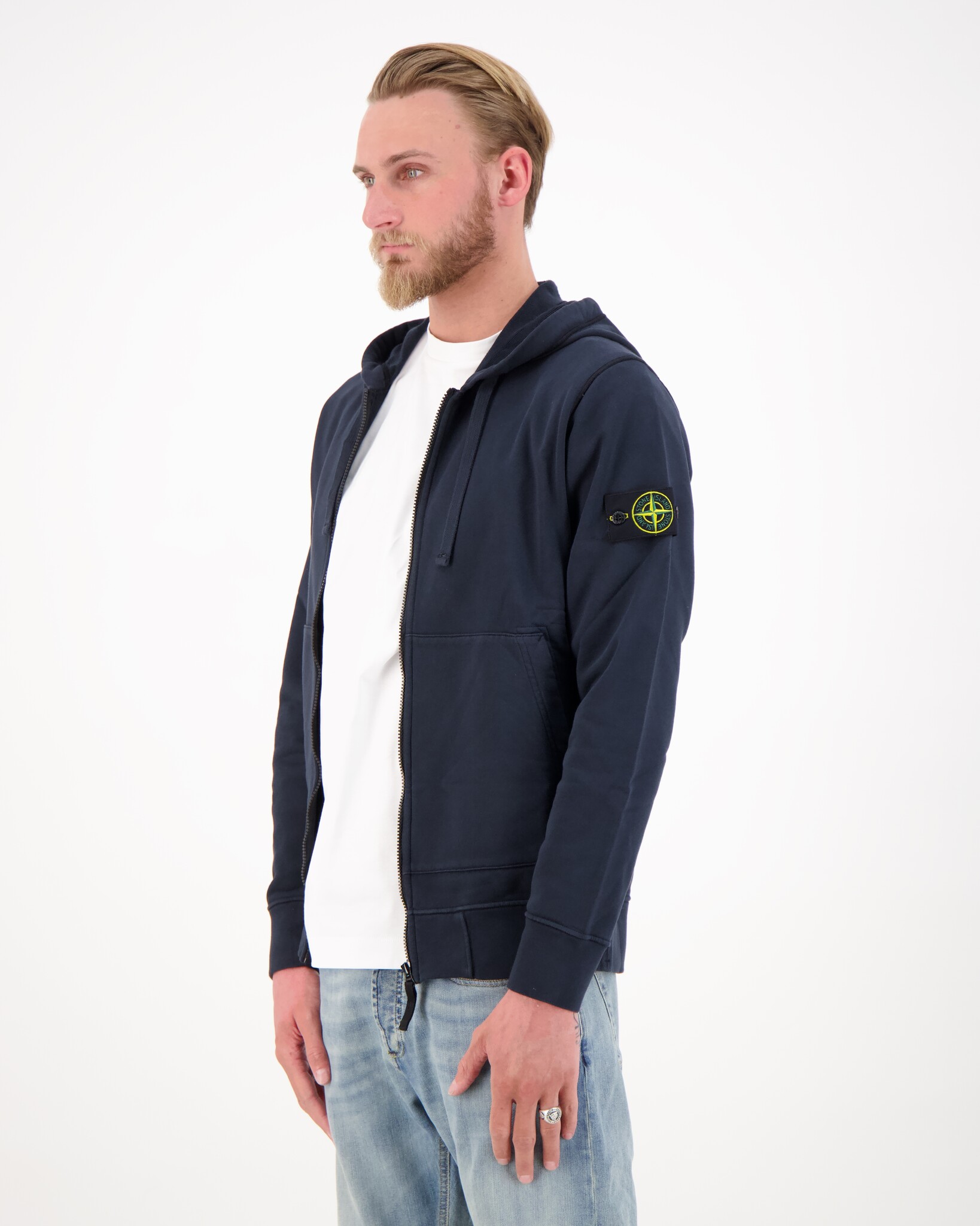 De hoodie heeft een regular fit en is voorzien van een capuchon met trekkoord, een volledige ritssluiting en praktische steekzakken. De geribde boorden zorgen voor een mooie aansluiting. Kenmerkend is de iconische Stone Island badge op de mouw, die afneembaar is.