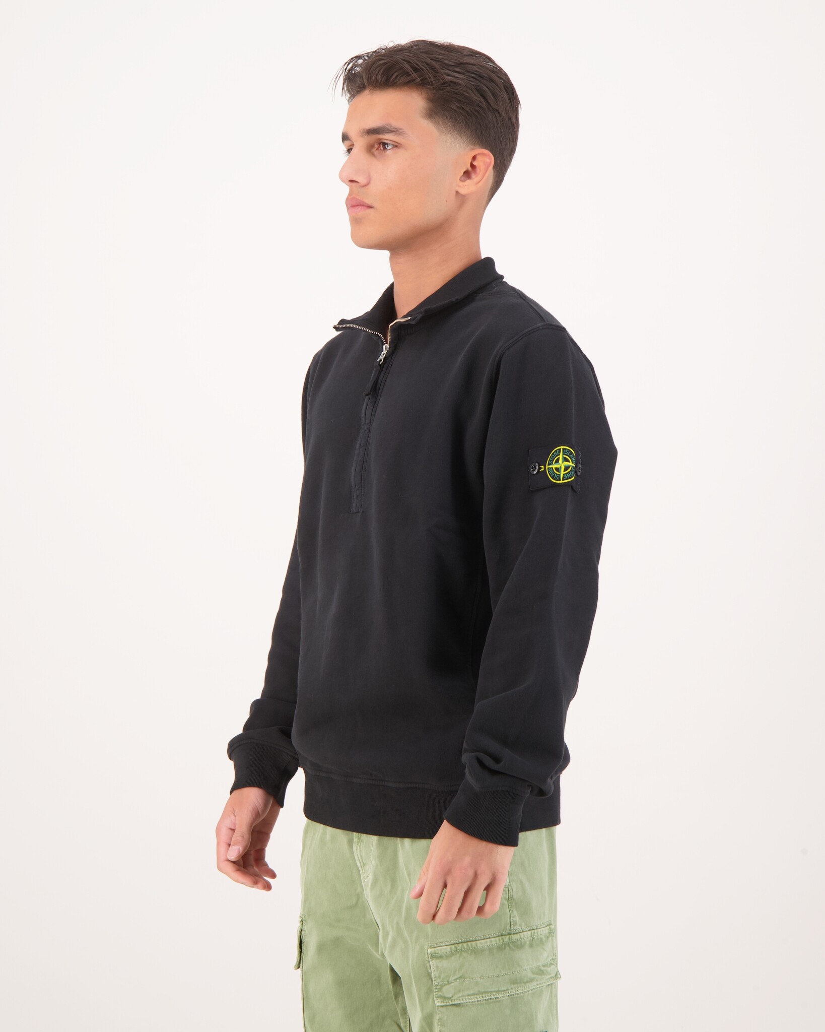 Zwarte '6100068 Half Zip LS Polo' van het merk Stone Island. De trui heeft een openstaande kraag en een zwarte rits. Op de linkermouw staat het bekende Stone Island-logo weergeven.