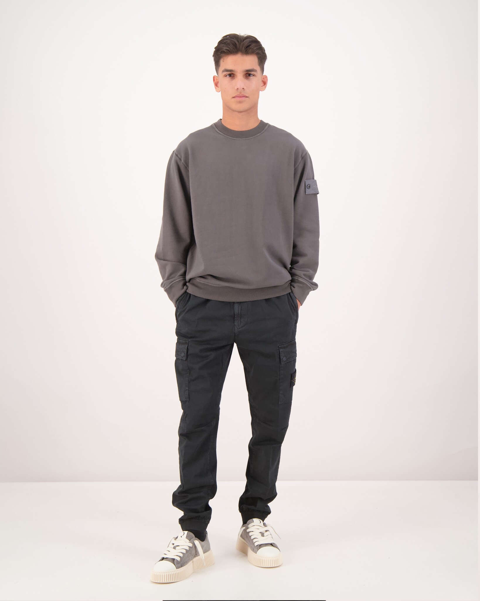Donkergrijze Ghost Piece Trui van het merk Stone Island. De Trui heeft lange mouwen en op de linkermouw staat het bekende Stone Island-logo weergeven in de zelfde kleur als het sweatshirt zelf.