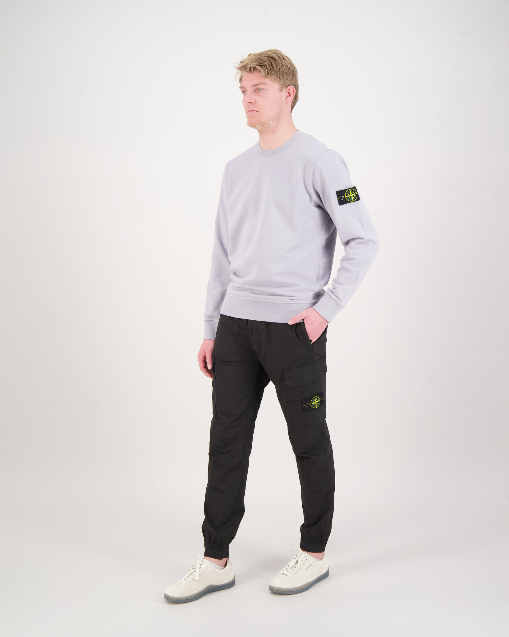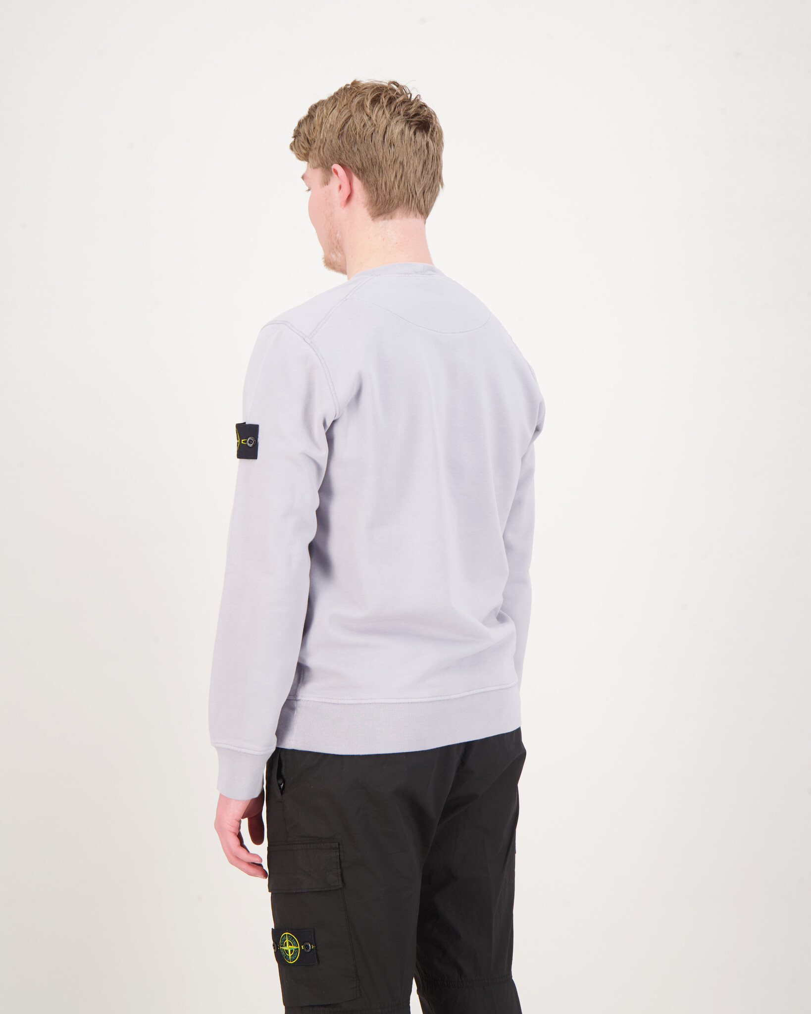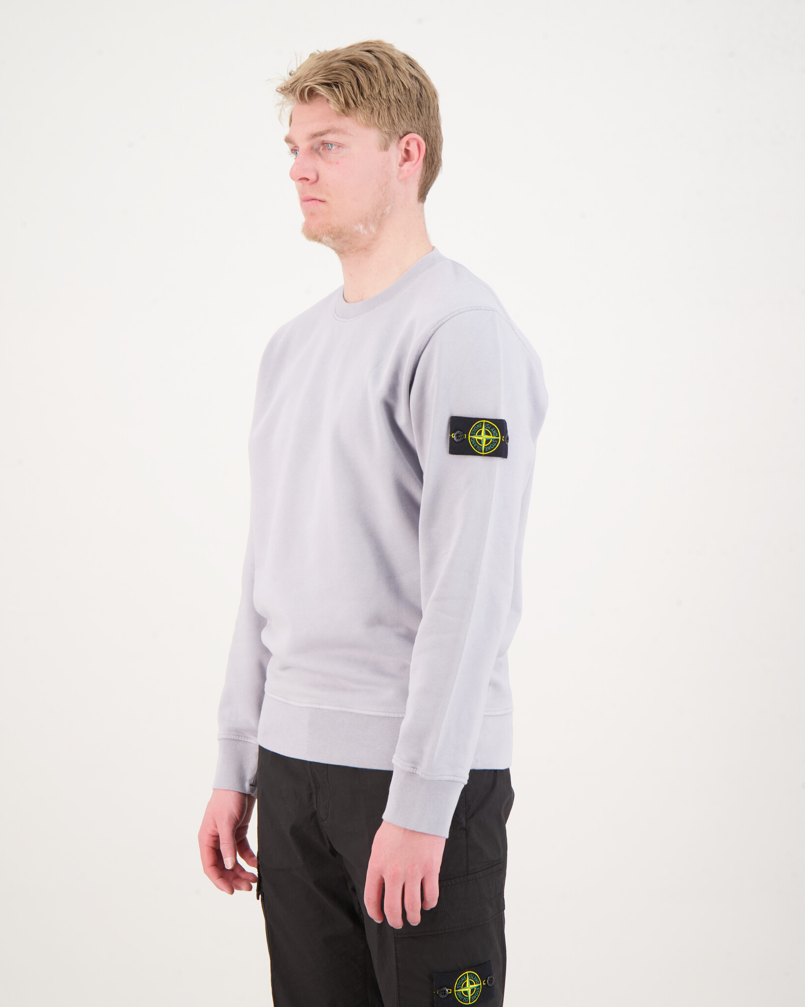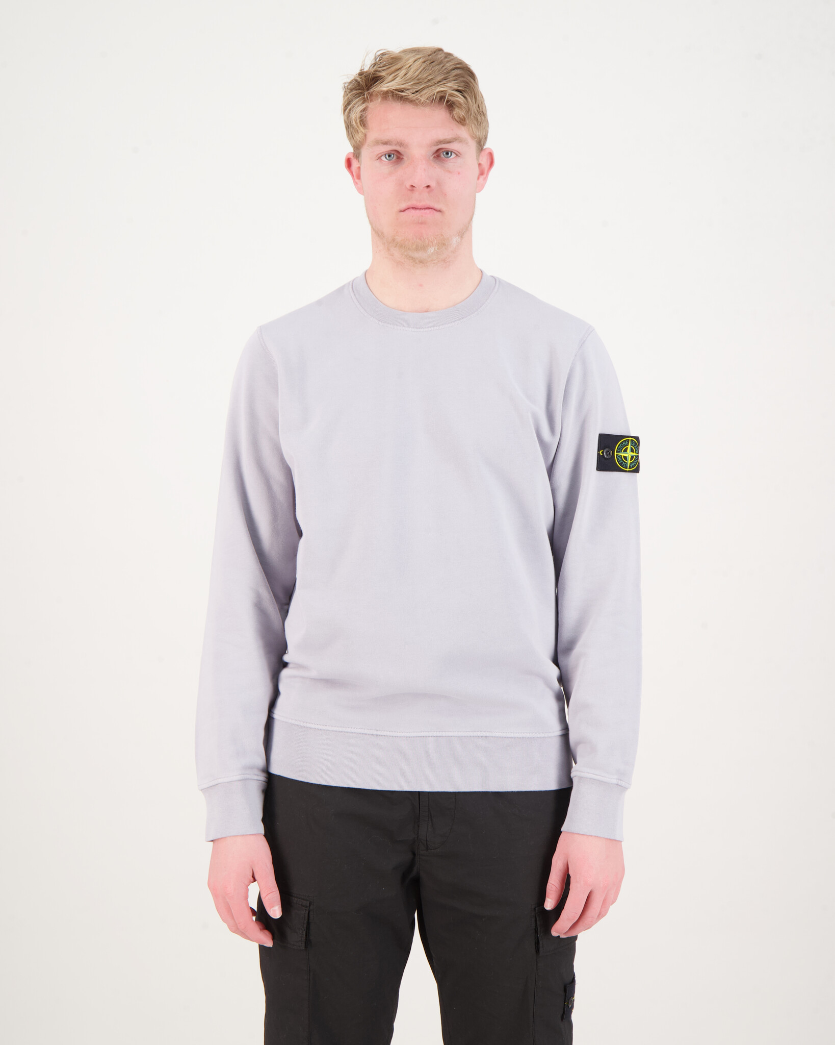 Donkergrijze Felpa Sweater van het merk Stone Island. De heeft een ronde hals en op de linker mouw de bekende Stone-Island badge.