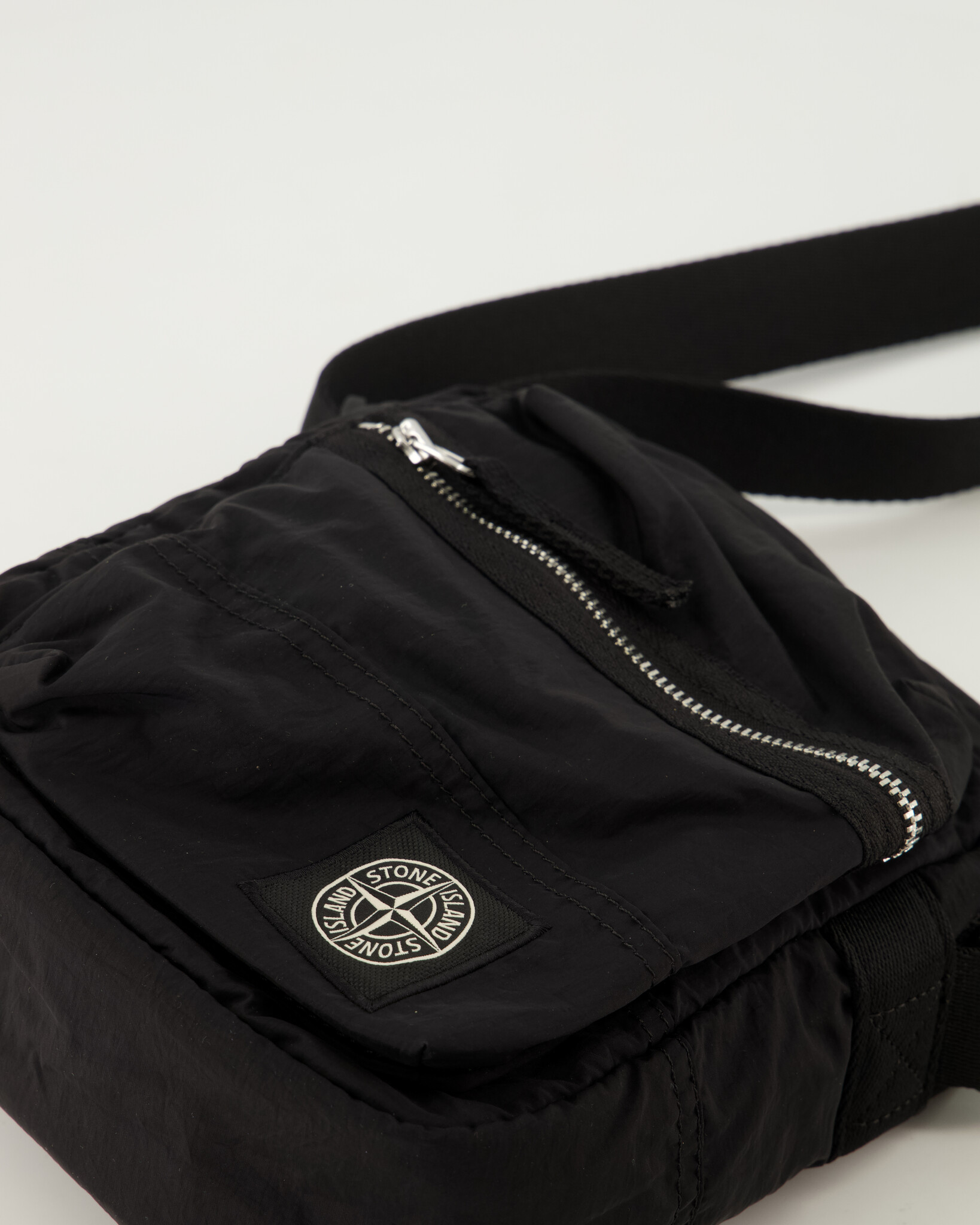 Zwarte 9200015 Coated Puch Nylon Metal In Econyl van het merk Stone Island. Bij de evolutie van deze iconische stof wordt gebruik gemaakt van ECONYL® geregenereerde garens: het nylon van voor en na de consumptie wordt gerecycled met een complex depolymerisatieproces om deze vezel te creëren die dezelfde intrinsieke eigenschappen heeft als nylon van fossiele grondstoffen.