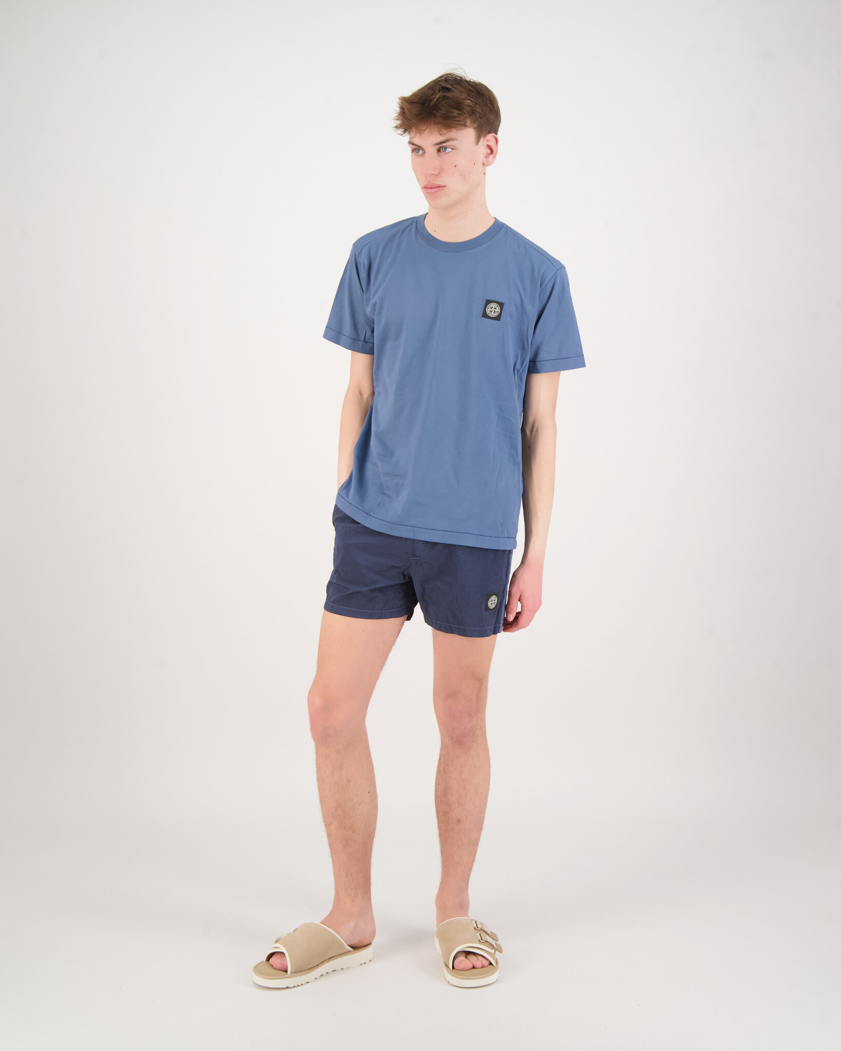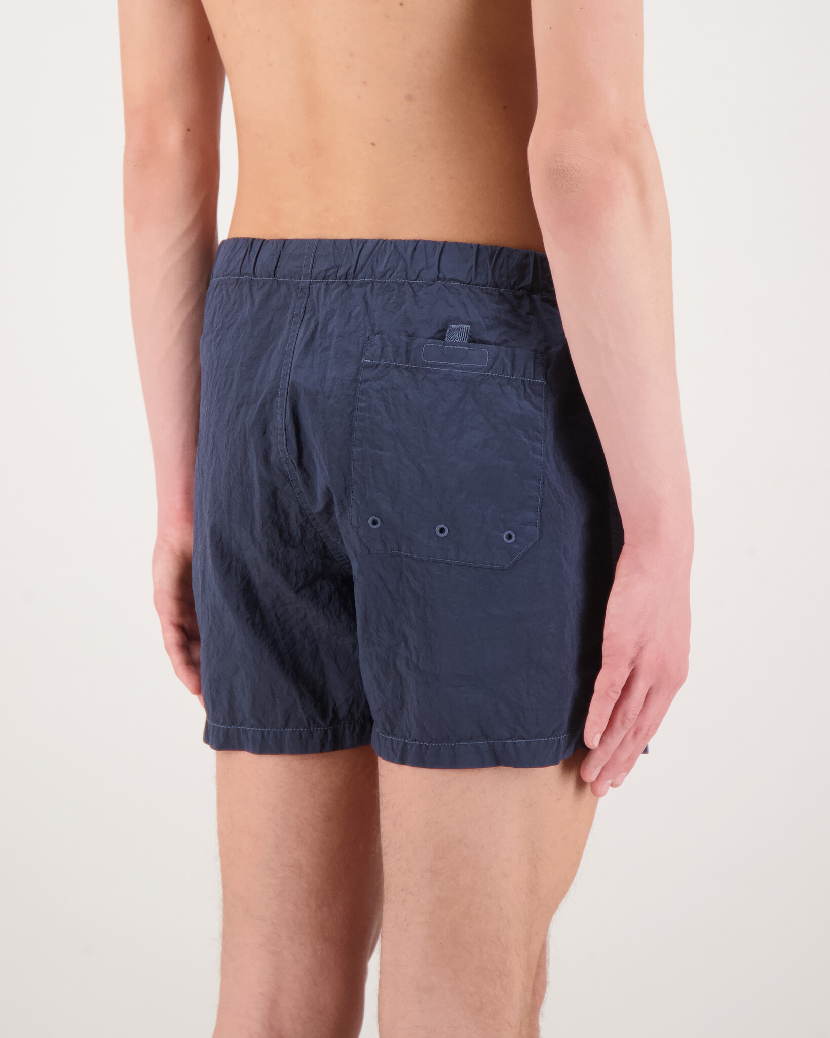 Donker Blauwe B0643 Nylon Metal Swim Shorts van het merk Stone Island. De zwembroek heeft een elastische tailleband met een aantrekkoord, heeft twee steekzakken, een achterzak met Klittenband en het bekende Stone Island logo op de linkerpijp. De broek heeft een glimmende gloed en aan de binnenkant een mesh binnenbroek.