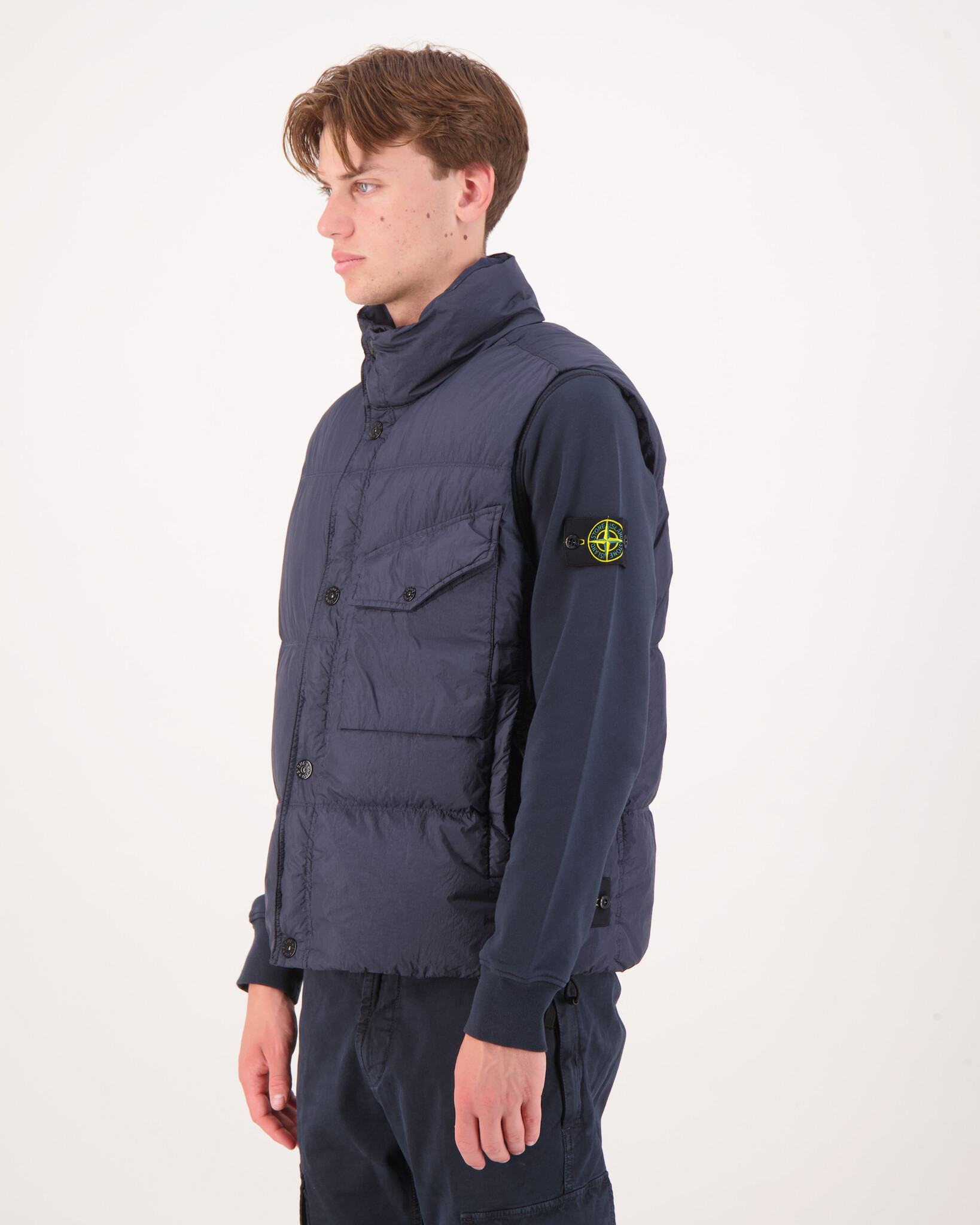 Marine G100003 Crinkle Reps NY Bodywarmer van het merk Stone Island. Donsvest van 100% gerecycled licht nylon rep met een ultrastrakke weefconstructie. De harscoating aan de binnenkant maakt het winddicht en licht waterafstotend. Het vest is gevuld met het fijnste dons dat speciaal behandeld is om het verven van het kledingstuk te weerstaan. Extra lichtheid en comfort worden bereikt door de directe injectie van de veren en door een vereenvoudigde constructie van de donszakken. Door de harsbehandeling van het materiaal dringt de kleur ongelijkmatig in het materiaal door, waardoor het oppervlak een rimpelig aspect krijgt. De toevoeging van een speciaal PFC-vrij middel aan de kleurstofformule zorgt ervoor dat het kledingstuk niet valt. RDS - Responsible Down Standard gecertificeerd.
