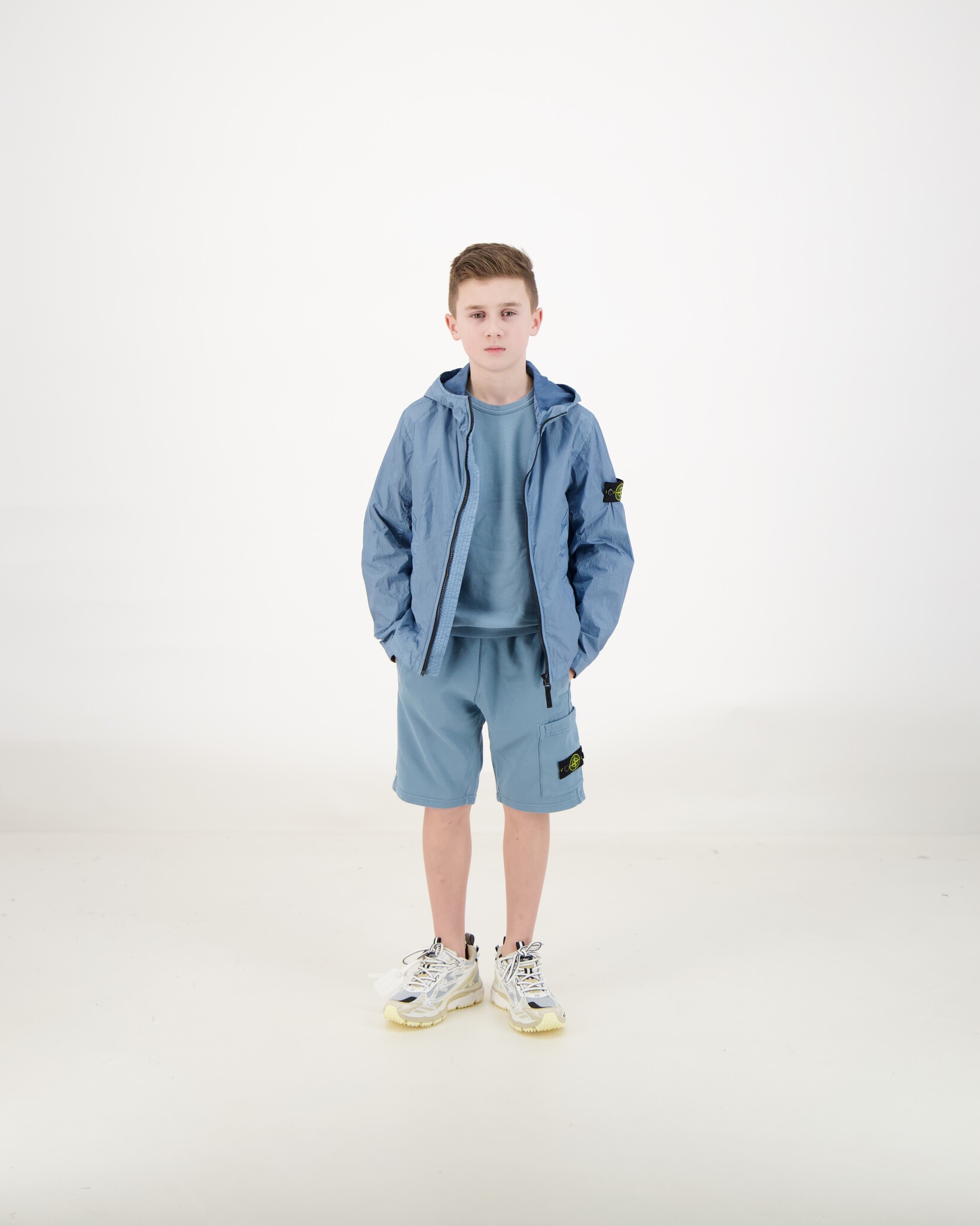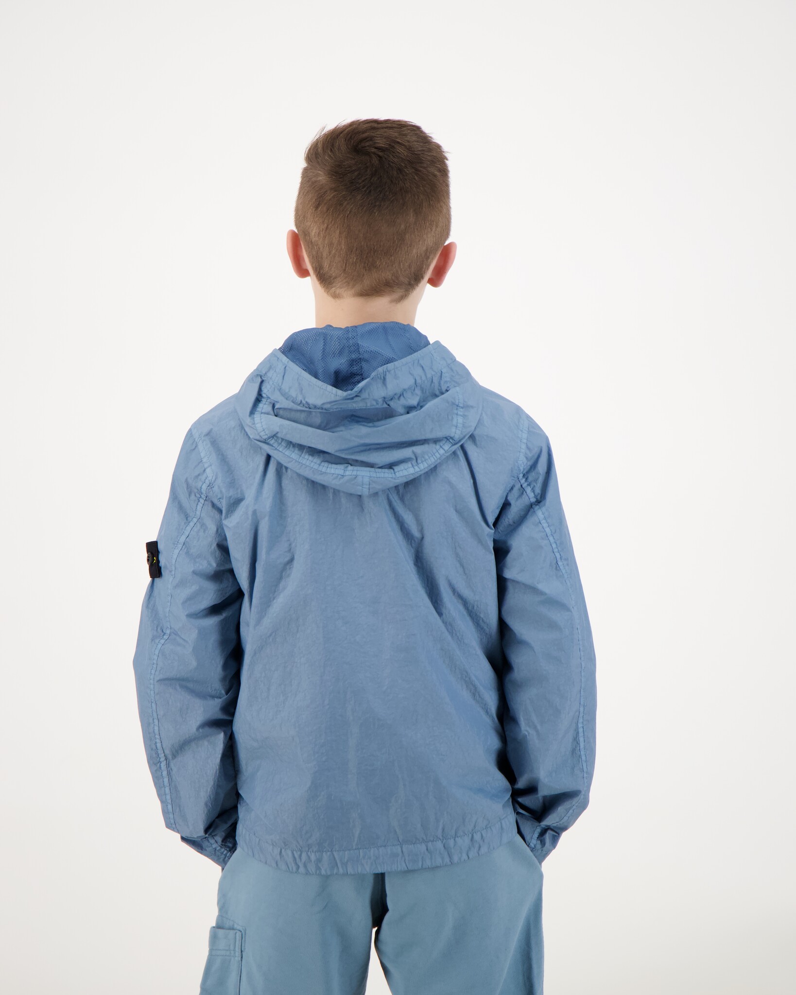 Powder Blue kleurige 4100003 Crinkle Reps Short Jas van het merk Stone Island Junior. Het is een lichte, gerecyclede nylon rep-stof met een erg dicht weefsel. Het heeft een hars-coating aan de binnenkant die het wind- en licht water-afstotend maakt. Door de specifieke behandeling ziet het oppervlak gekreukt (crinkled) uit — dit geeft de jas een unieke textuur en uitstraling.