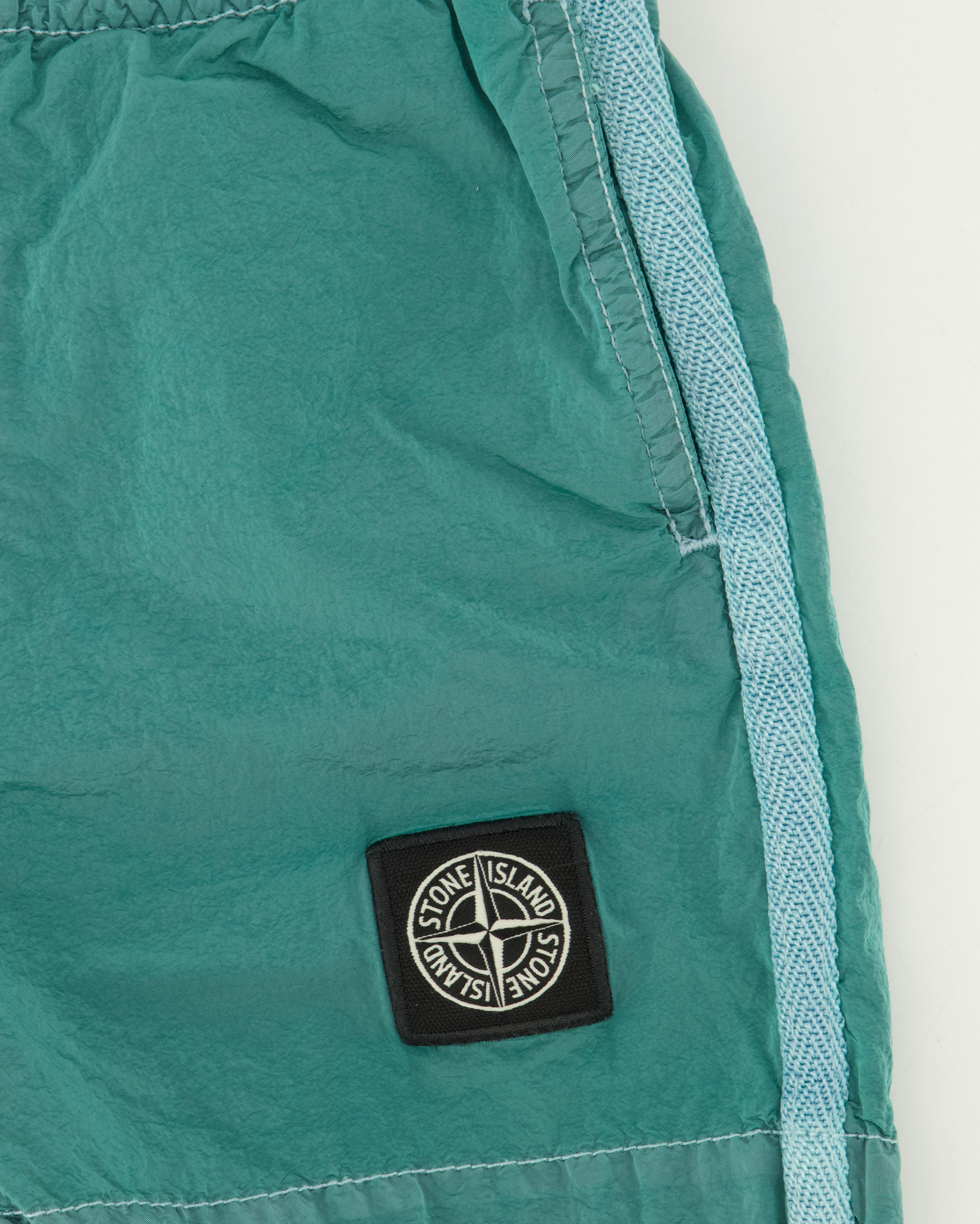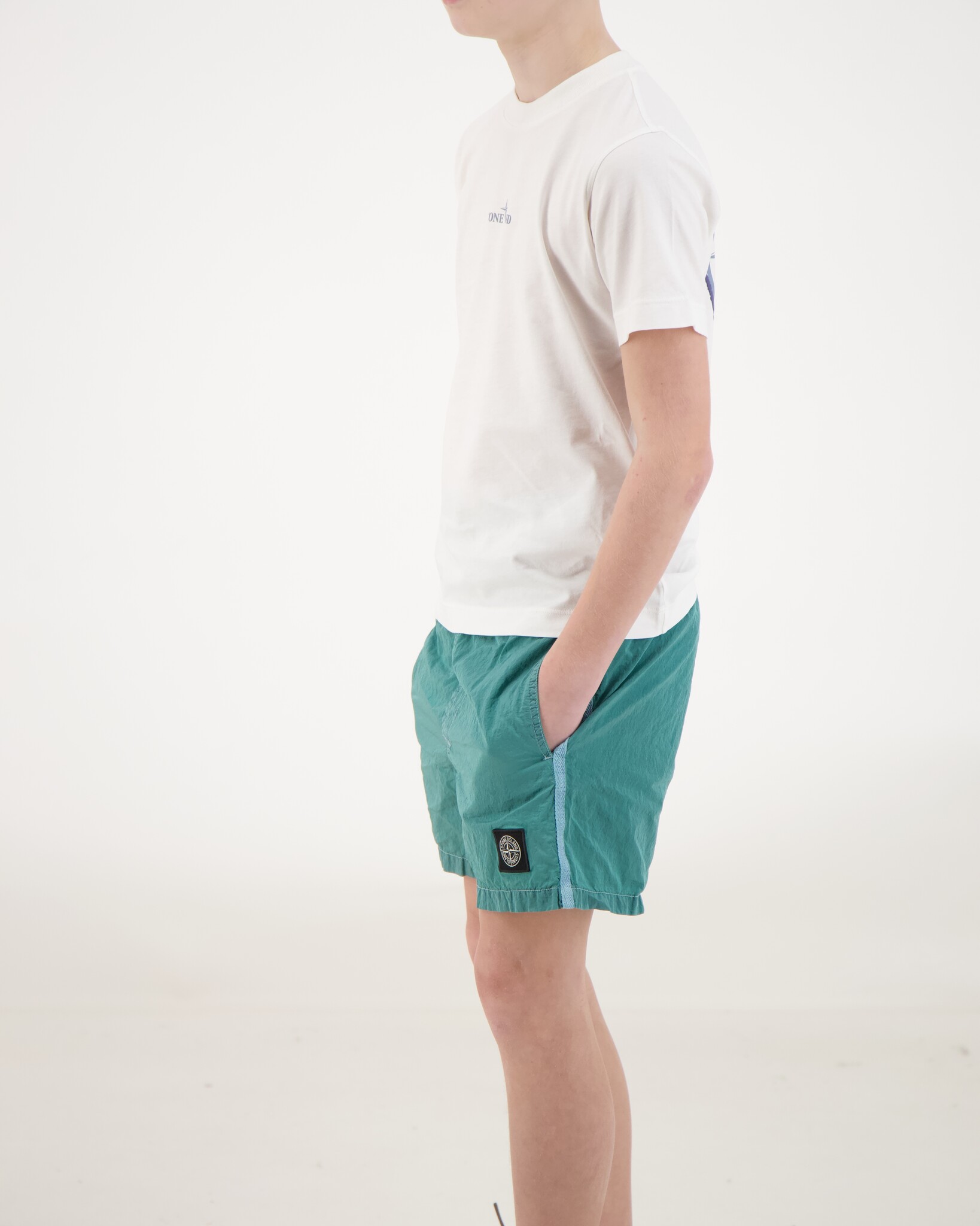 Aqua B100002 Nylon Metal In Econyl Regenerated Swim Shorts van het merk Stone Island Junior. De zwembroek heeft een elastische tailleband met een aantrekkoort, heeft twee steekzakken, een achterzak met Klittenband en het bekende Stone Island logo op de linkerpijp. De broek heeft een glimmende gloed en aan de binnenkant een mesh binnenbroek.