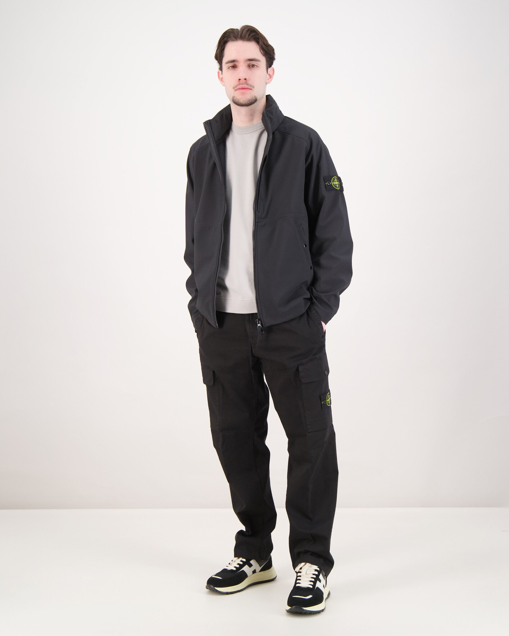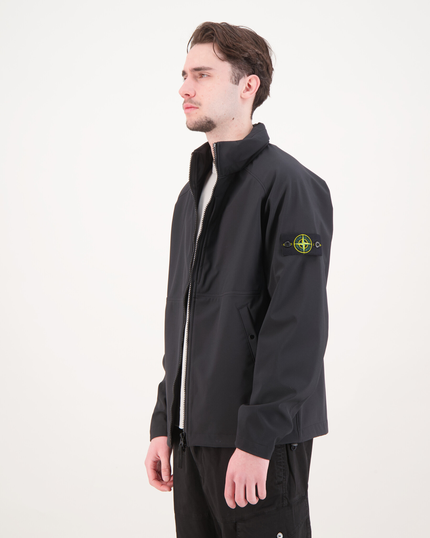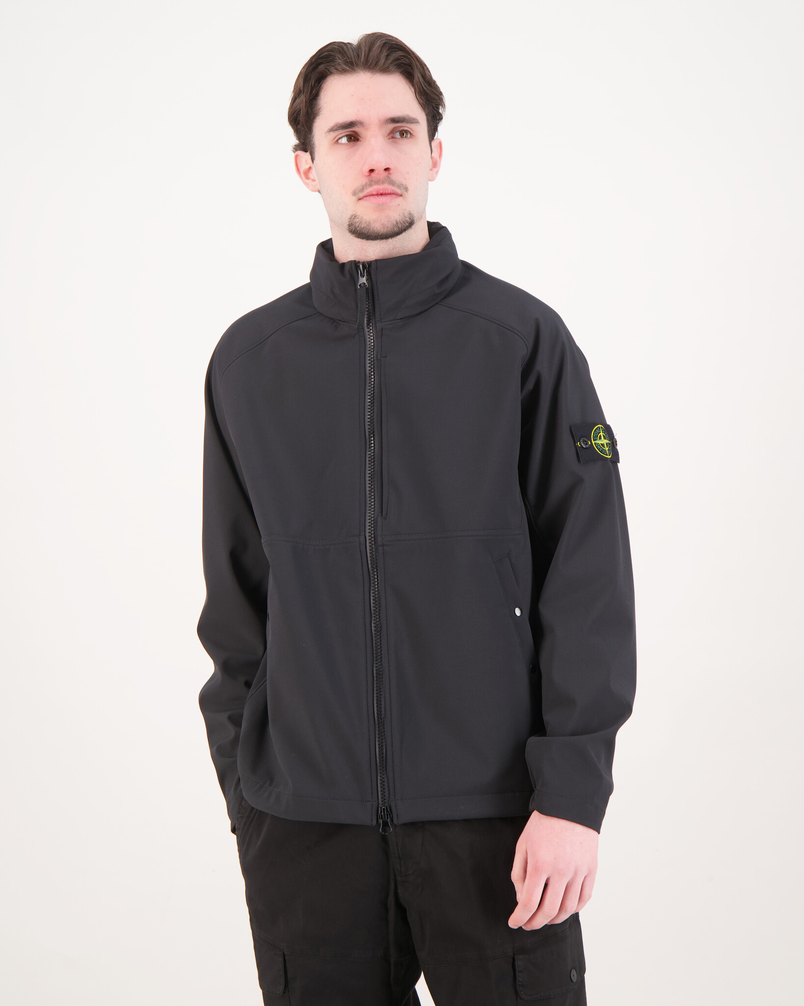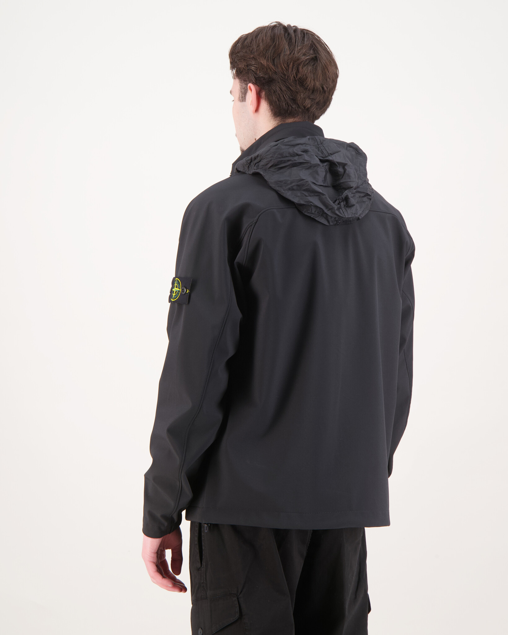 Zwarte Light Soft Shell e.dye Technology Jacket van het merk Stone Island. Deze soft shell jas heeft een capuchon, twee zakken aan de voorzijde met drukkopen en de bekende Stone Island badge op de linkermouw. Dit jack is ademend, waterafstotend en wind bestendig.