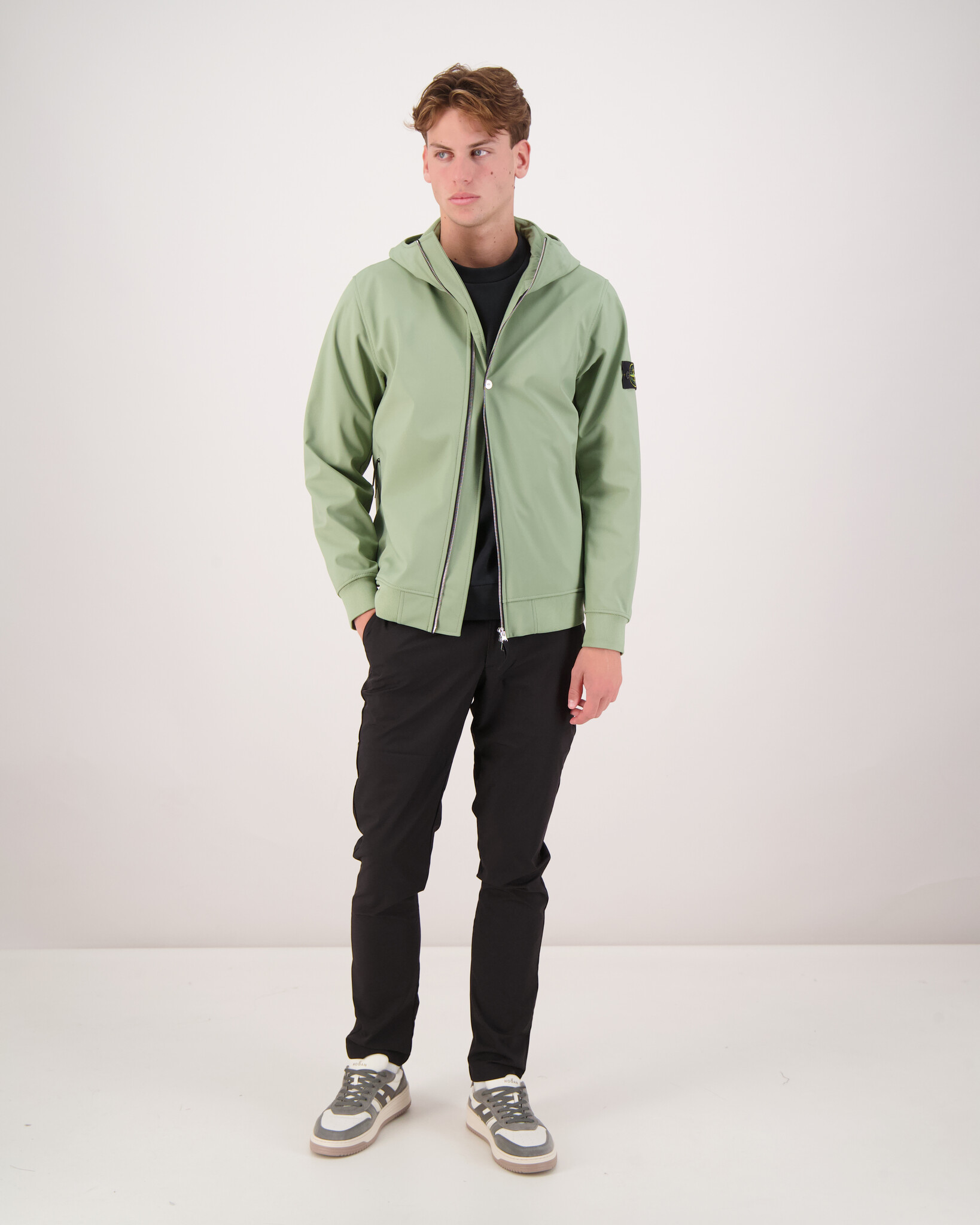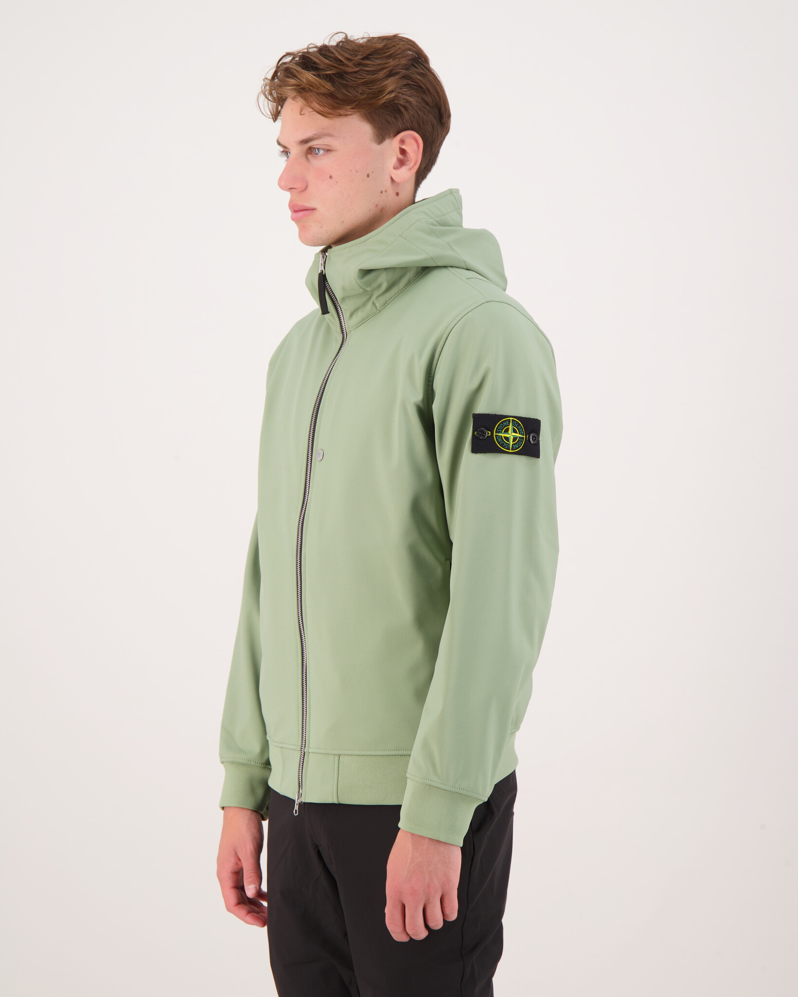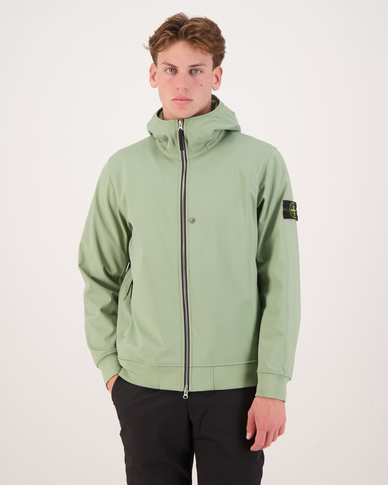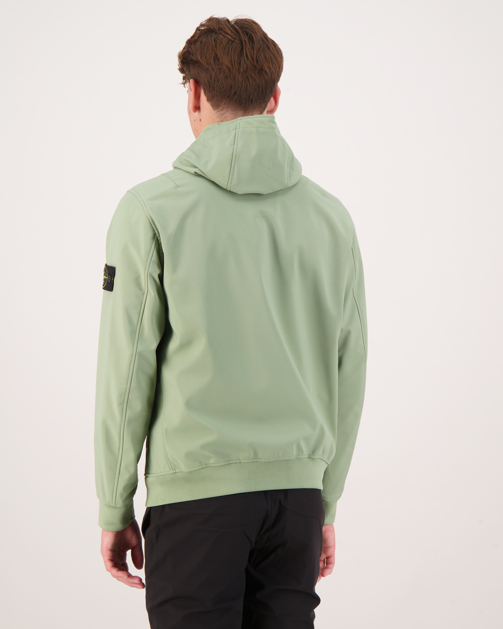 Sage 'Q100004 Soft Shell Light hooded Jas' van het merk Stone Island. Licht jack met capuchon van 3-laags materiaal met een waterkolom van 8000 MM. De buitenkant van 100% gerecycled polyester stretchcanvas is geweven met garens die gebruikmaken van de e.dye® Waterless Color System™-technologie, het innovatieve kleurverzadigingssysteem van garens dat het gebruik van water met 85% vermindert en het gebruik van chemicaliën in het verfproces met 90% terugdringt. De stof is gelamineerd op een ademend, wind- en waterafstotend binnenmembraan, beschermd door een polyester poolrug. De