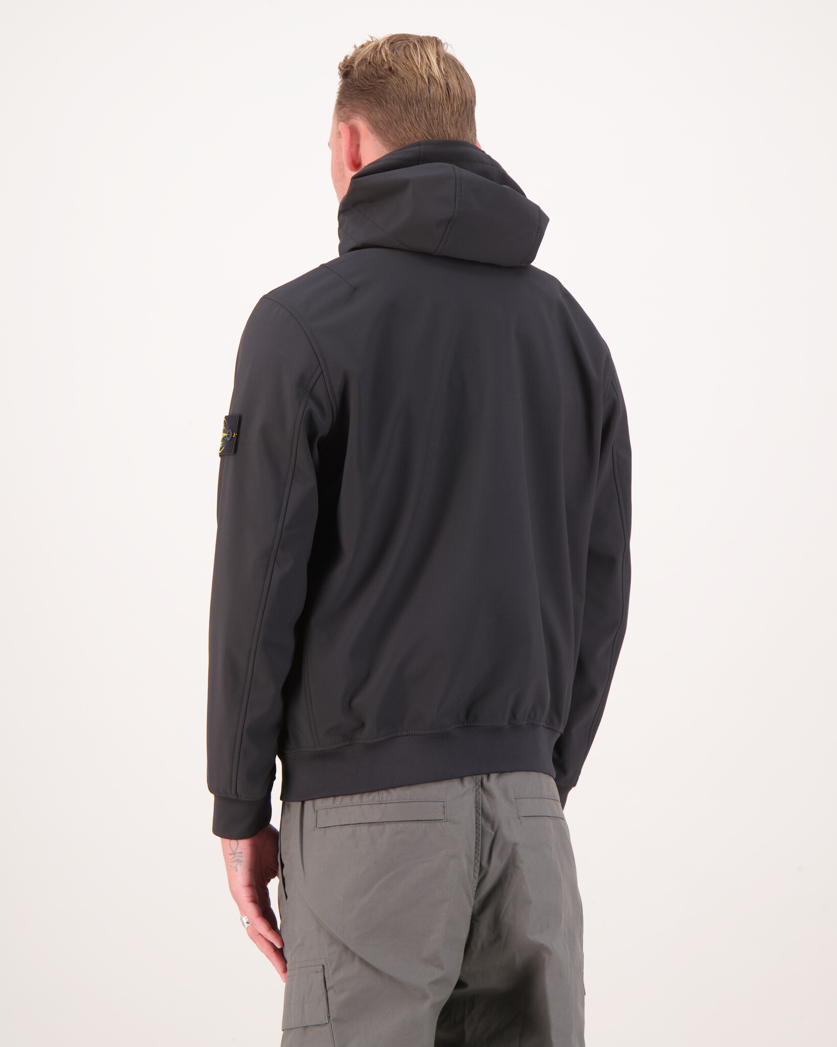 Zwarte 'Q100004 Soft Shell Light hooded Jas' van het merk Stone Island. Licht jack met capuchon van 3-laags materiaal met een waterkolom van 8000 MM. De buitenkant van 100% gerecycled polyester stretchcanvas is geweven met garens die gebruikmaken van de e.dye® Waterless Color System™-technologie, het innovatieve kleurverzadigingssysteem van garens dat het gebruik van water met 85% vermindert en het gebruik van chemicaliën in het verfproces met 90% terugdringt. De stof is gelamineerd op een ademend, wind- en waterafstotend binnenmembraan, beschermd door een polyester poolrug. De