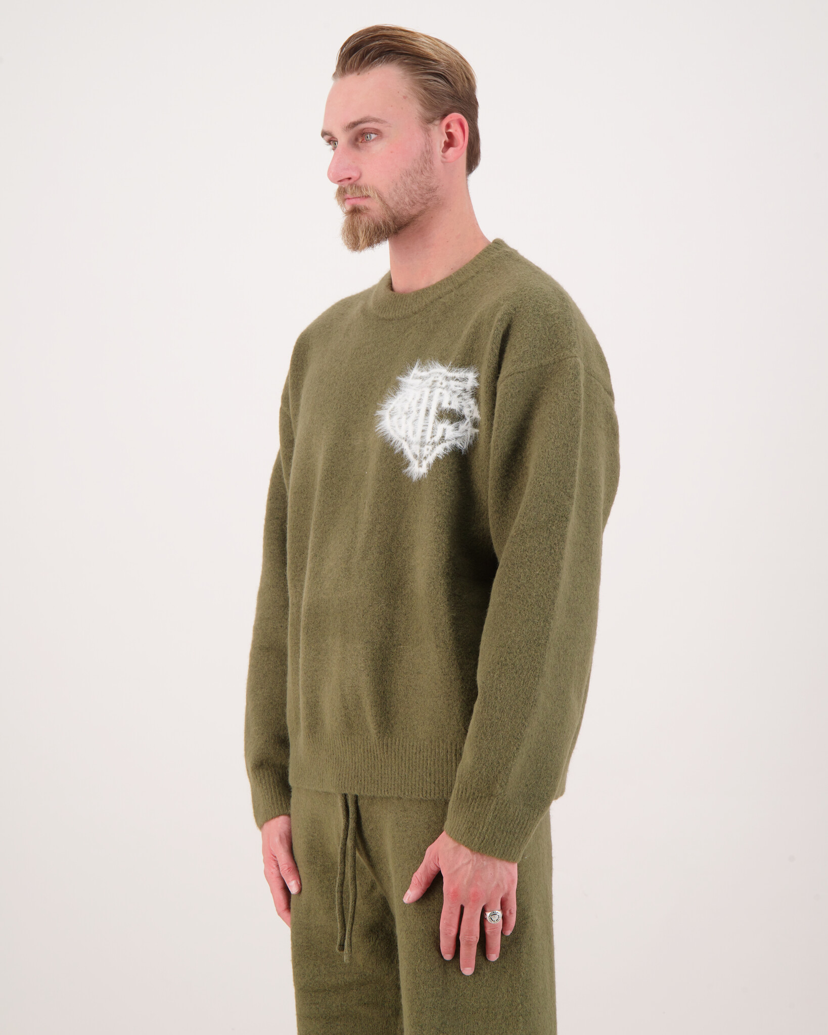 Khaki Monogram Emblem Fluffy Knit Crewneck van het merk The Couture Club. De “fluffy knit” textuur geeft de trui een zachtere, cosy uitstraling — ideaal voor casual of “elevated casual” looks. Op de borst zit een “jacquard fluffy knit monogram emblem graphic” (oftewel een ingebreid monogram-embleem in dezelfde fluffy stijl). Geribde boorden aan mouwuiteinden en onderkant. De pasvorm is “relaxed” — dus niet strak/slim fit, maar met wat meer ruimte. Dit betekent dat hij comfortabeler zit.