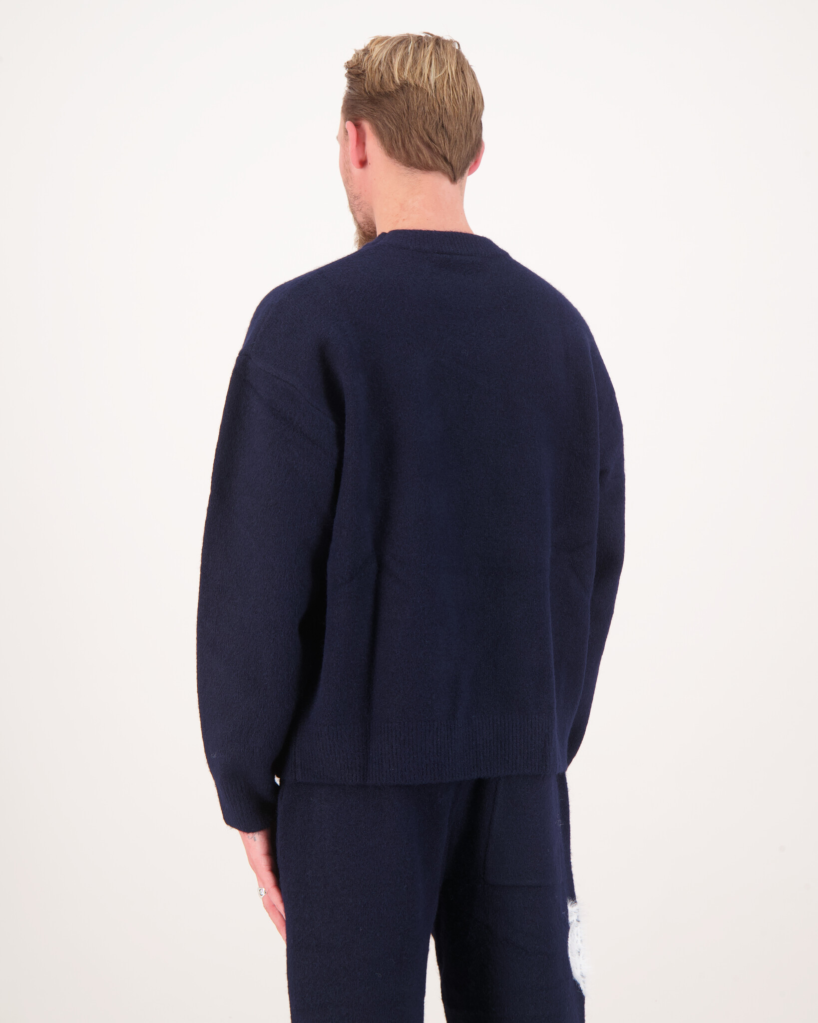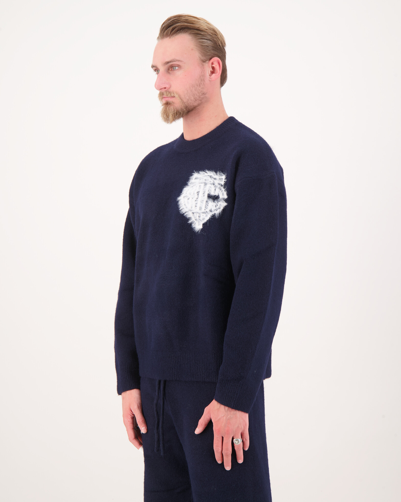 Marine Monogram Emblem Fluffy Knit Crewneck van het merk The Couture Club. De “fluffy knit” textuur geeft de trui een zachtere, cosy uitstraling — ideaal voor casual of “elevated casual” looks. Op de borst zit een “jacquard fluffy knit monogram emblem graphic” (oftewel een ingebreid monogram-embleem in dezelfde fluffy stijl). Geribde boorden aan mouwuiteinden en onderkant. De pasvorm is “relaxed” — dus niet strak/slim fit, maar met wat meer ruimte. Dit betekent dat hij comfortabeler zit.