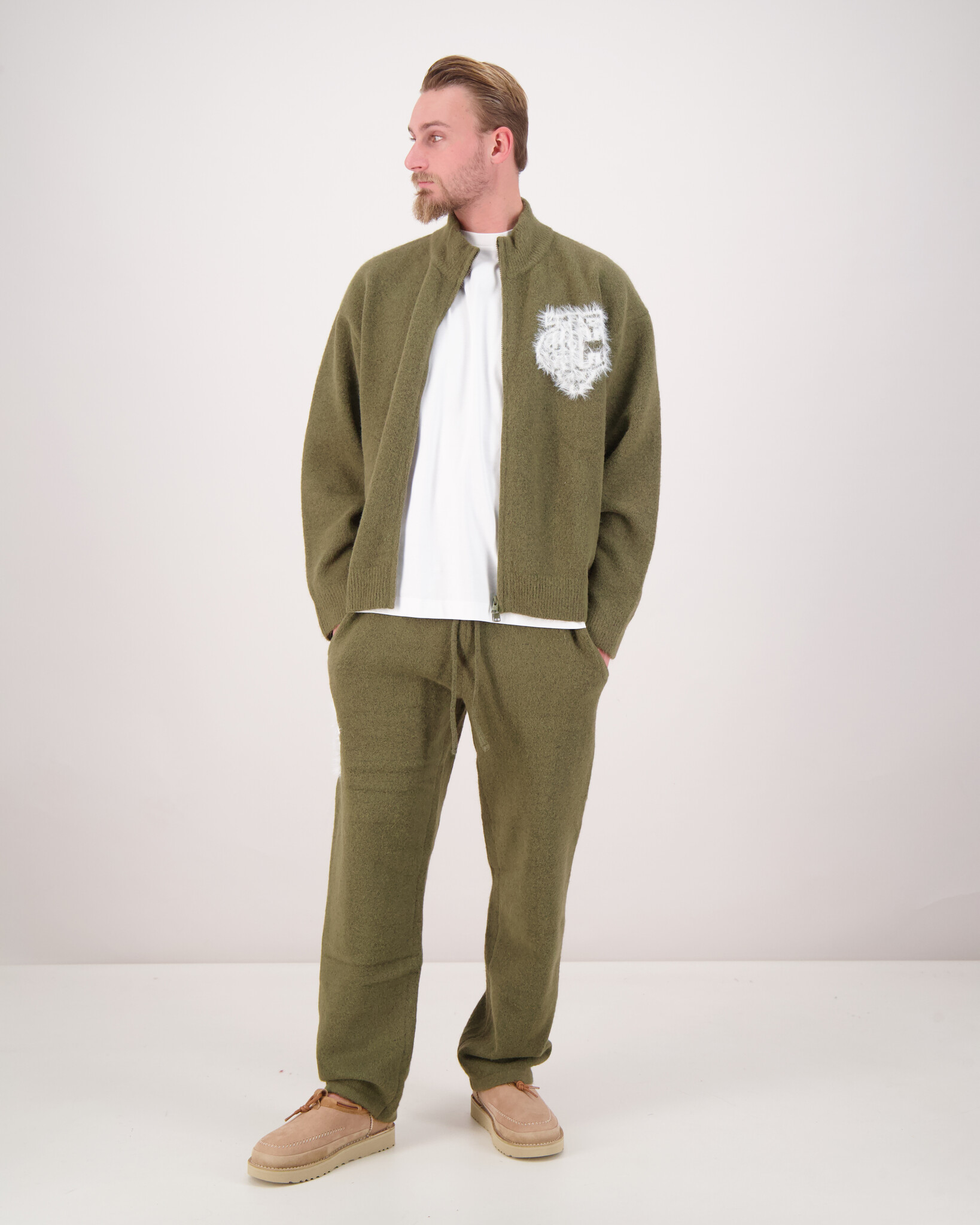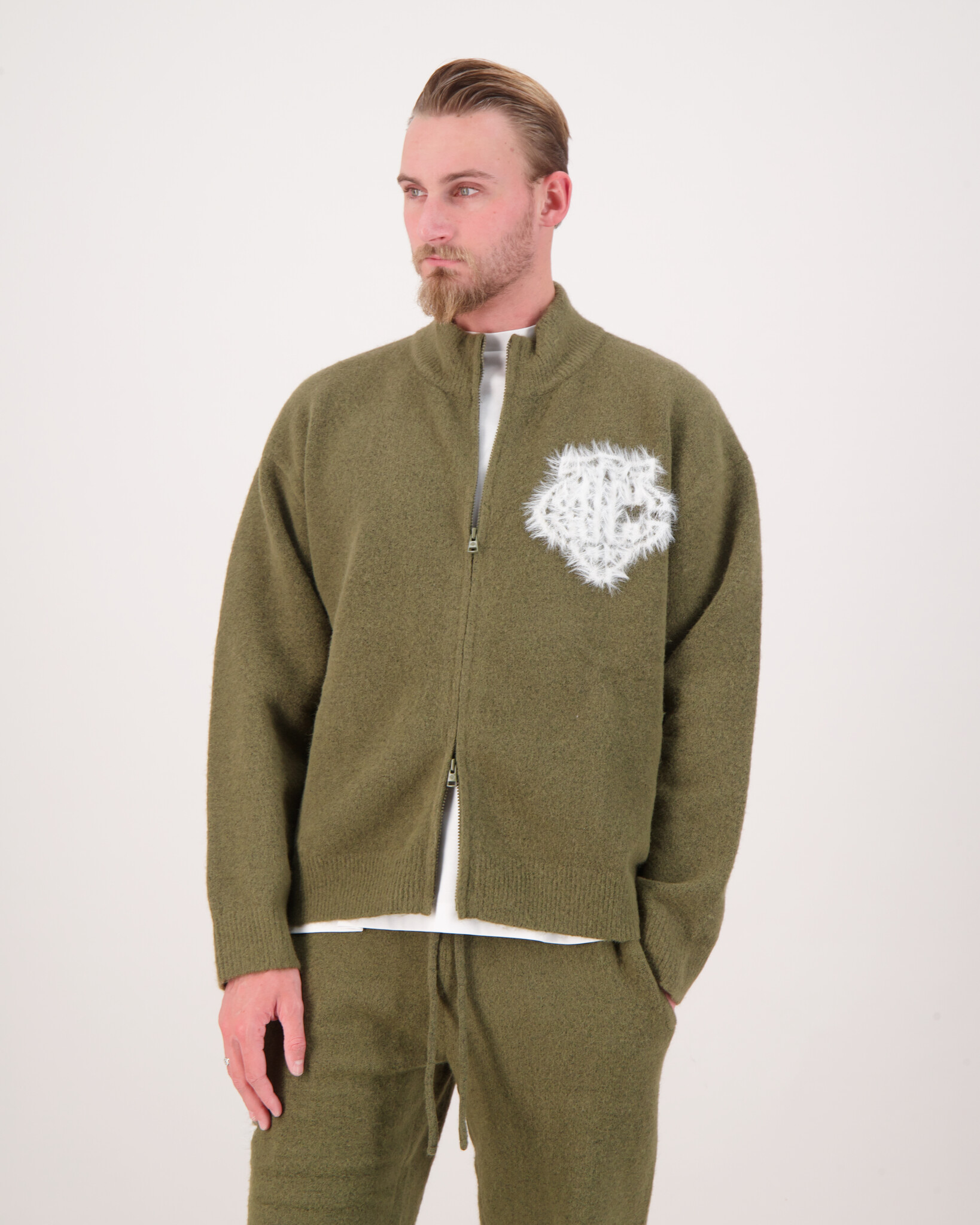 Khaki Monogram Emblem Fluffy Knit Zip van het merk The Couture Club. De “fluffy knit” textuur geeft de trui een zachtere, cosy uitstraling — ideaal voor casual of “elevated casual” looks. Op de borst zit een “jacquard fluffy knit monogram emblem graphic” (oftewel een ingebreid monogram-embleem in dezelfde fluffy stijl). Geribde boorden aan mouwuiteinden en onderkant. De pasvorm is “relaxed” — dus niet strak/slim fit, maar met wat meer ruimte. Dit betekent dat hij comfortabeler zit. Dit vest heeft een rits waardoor je hem zowel dicht als open kan dragen.