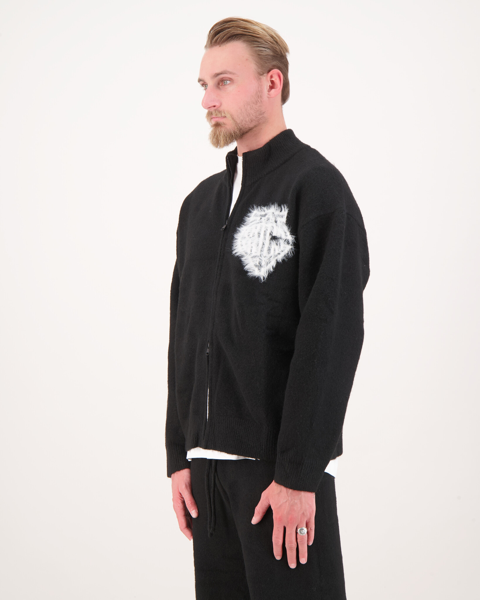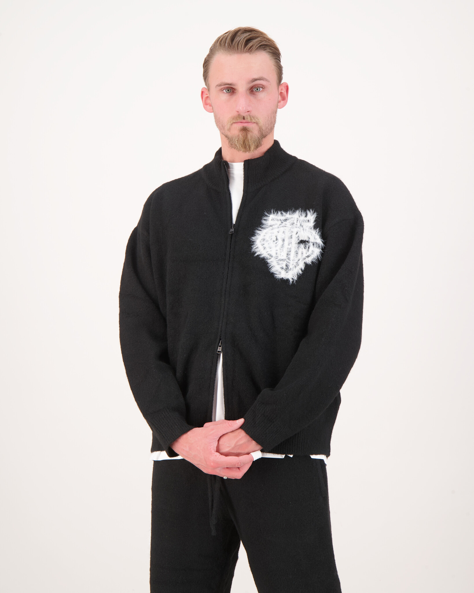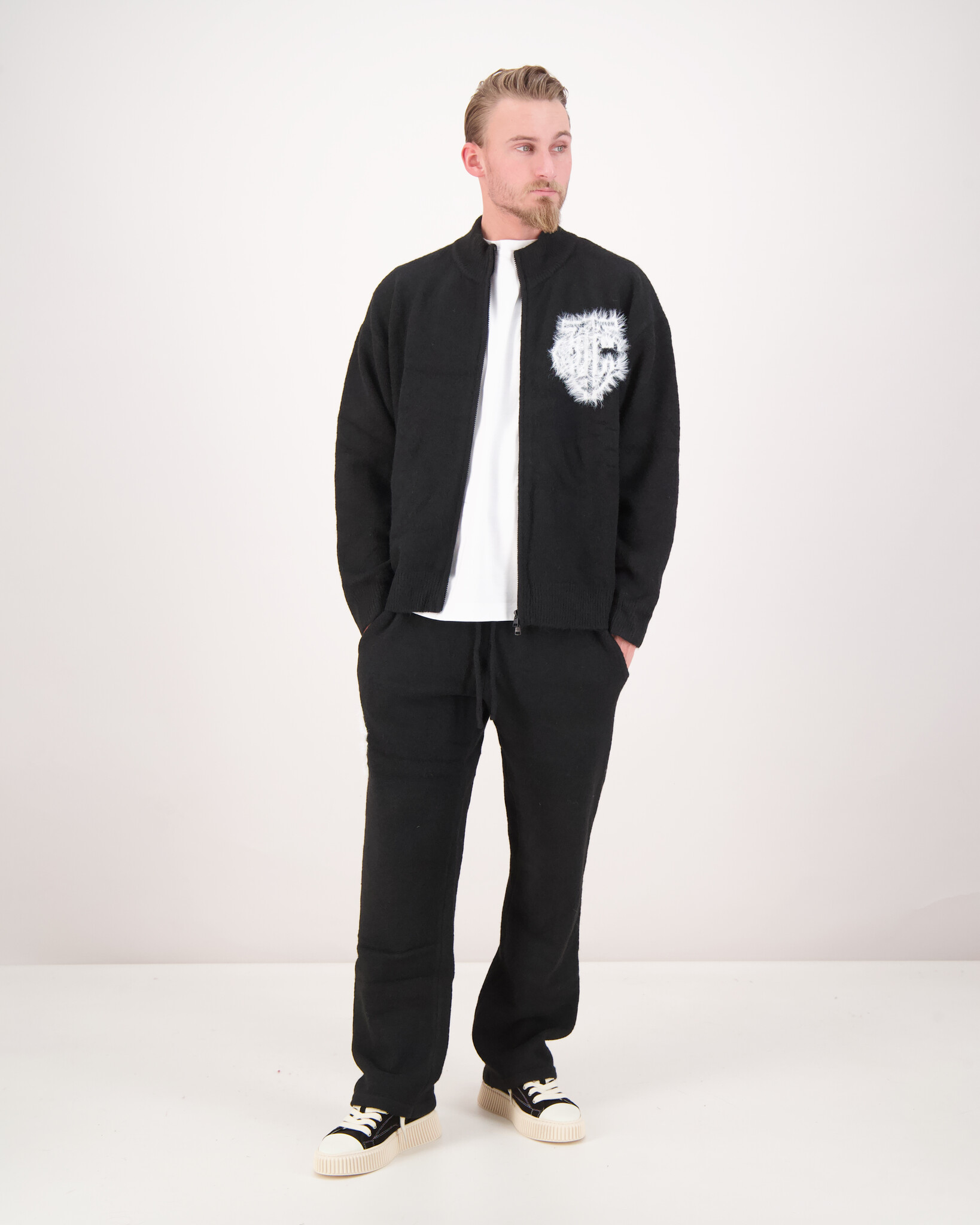 Zwarte Monogram Emblem Fluffy Knit Zip van het merk The Couture Club. De “fluffy knit” textuur geeft de trui een zachtere, cosy uitstraling — ideaal voor casual of “elevated casual” looks. Op de borst zit een “jacquard fluffy knit monogram emblem graphic” (oftewel een ingebreid monogram-embleem in dezelfde fluffy stijl). Geribde boorden aan mouwuiteinden en onderkant. De pasvorm is “relaxed” — dus niet strak/slim fit, maar met wat meer ruimte. Dit betekent dat hij comfortabeler zit. Dit vest heeft een rits waardoor je hem zowel dicht als open kan dragen.