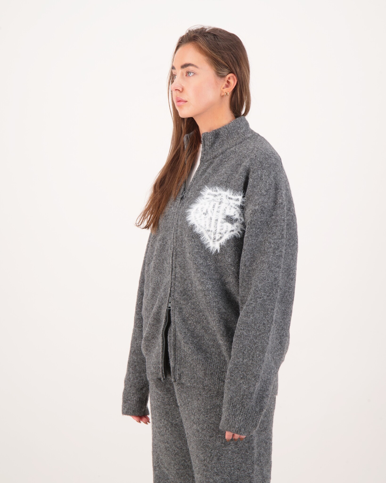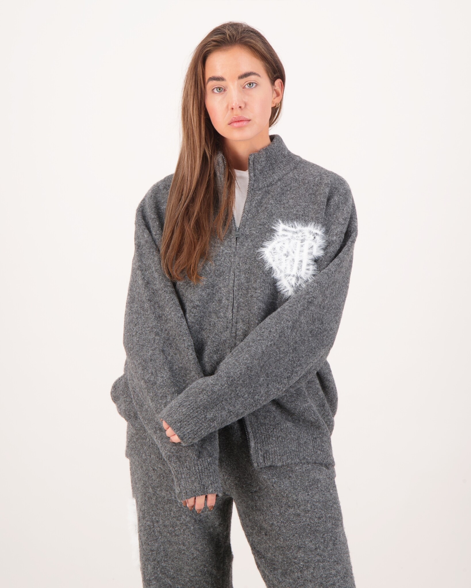 Charcoal Monogram Emblem Fluffy Knit Zip van het merk The Couture Club. De “fluffy knit” textuur geeft de trui een zachtere, cosy uitstraling — ideaal voor casual of “elevated casual” looks. Op de borst zit een “jacquard fluffy knit monogram emblem graphic” (oftewel een ingebreid monogram-embleem in dezelfde fluffy stijl). Geribde boorden aan mouwuiteinden en onderkant. De pasvorm is “relaxed” — dus niet strak/slim fit, maar met wat meer ruimte. Dit betekent dat hij comfortabeler zit. Dit vest heeft een rits waardoor je hem zowel dicht als open kan dragen.