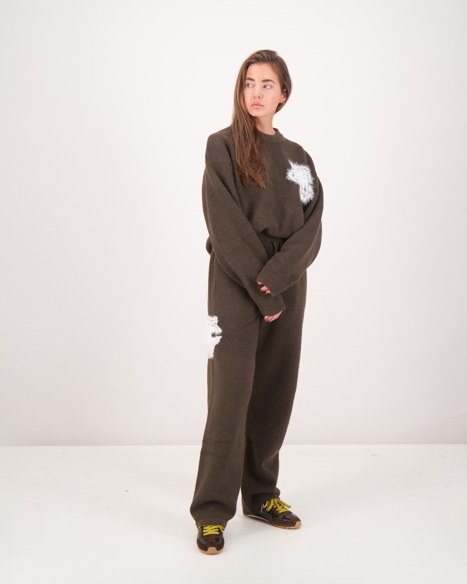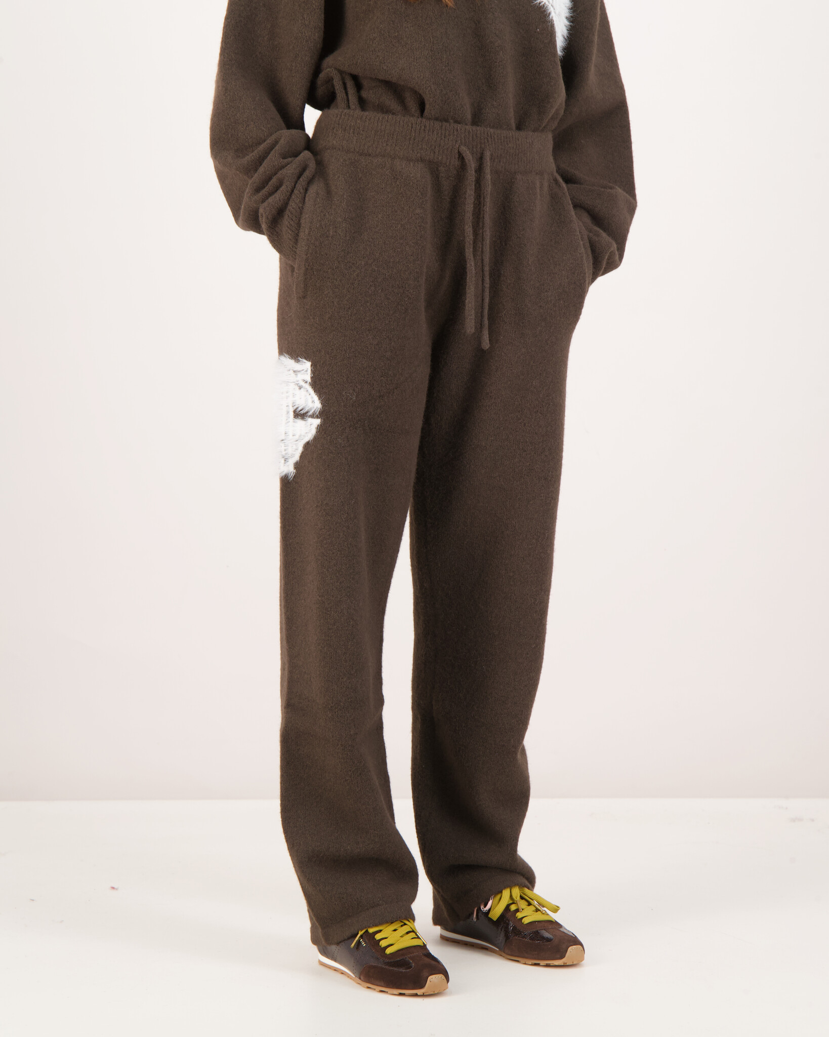 Bruine Monogram Emblem Fluffy Knit Zip van het merk The Couture Club. De “fluffy knit” textuur geeft de broek een zachtere, cosy uitstraling — ideaal voor casual of “elevated casual” looks. Op de rechterbeen zit een “jacquard fluffy knit monogram emblem graphic” (oftewel een ingebreid monogram-embleem in dezelfde fluffy stijl). Geribde boorden aan mouwuiteinden en onderkant. De pasvorm is “relaxed” — dus niet strak/slim fit, maar met wat meer ruimte. Dit betekent dat hij comfortabeler zit.