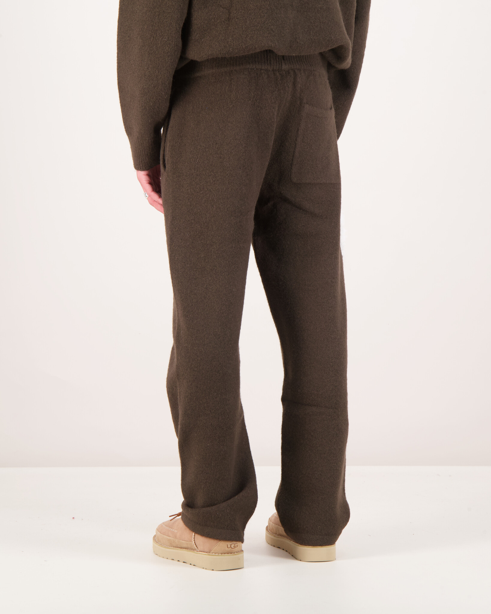 Bruine Monogram Emblem Fluffy Knit Zip van het merk The Couture Club. De “fluffy knit” textuur geeft de broek een zachtere, cosy uitstraling — ideaal voor casual of “elevated casual” looks. Op de rechterbeen zit een “jacquard fluffy knit monogram emblem graphic” (oftewel een ingebreid monogram-embleem in dezelfde fluffy stijl). Geribde boorden aan mouwuiteinden en onderkant. De pasvorm is “relaxed” — dus niet strak/slim fit, maar met wat meer ruimte. Dit betekent dat hij comfortabeler zit.