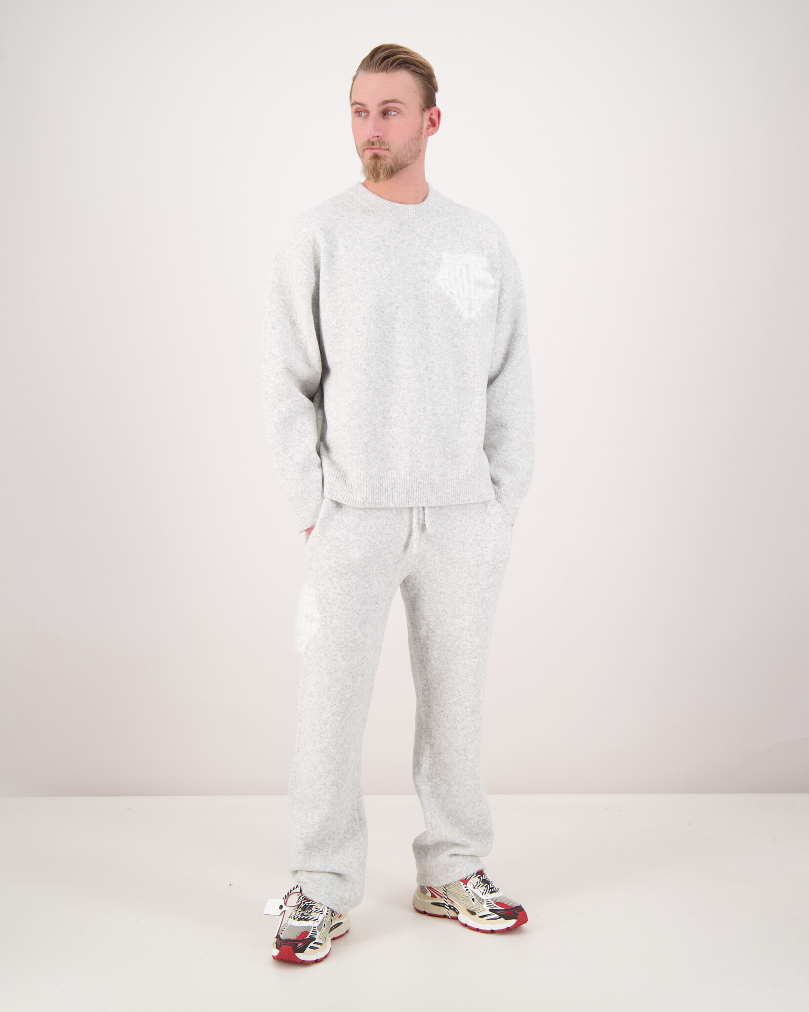 Grijze Monogram Emblem Fluffy Knit Zip van het merk The Couture Club. De “fluffy knit” textuur geeft de broek een zachtere, cosy uitstraling — ideaal voor casual of “elevated casual” looks. Op de rechterbeen zit een “jacquard fluffy knit monogram emblem graphic” (oftewel een ingebreid monogram-embleem in dezelfde fluffy stijl). Geribde boorden aan mouwuiteinden en onderkant. De pasvorm is “relaxed” — dus niet strak/slim fit, maar met wat meer ruimte. Dit betekent dat hij comfortabeler zit.