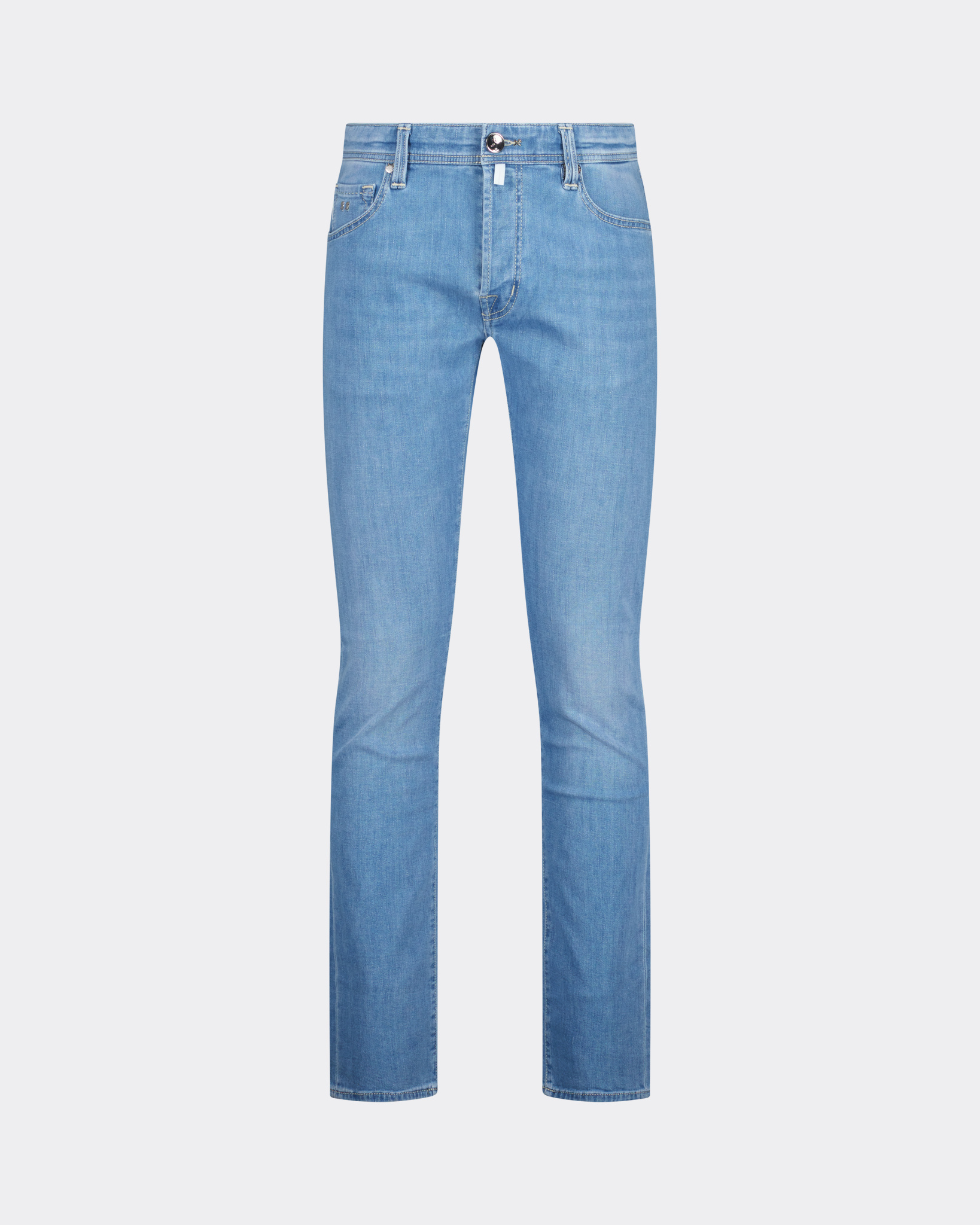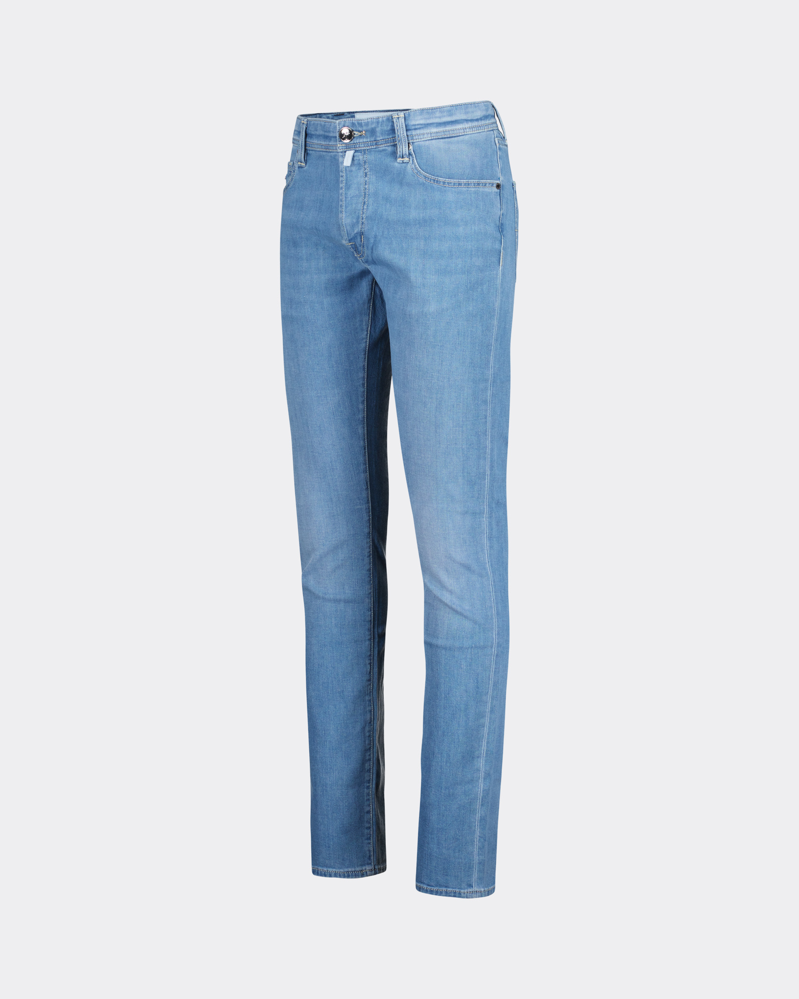 Blauwe ' Leonardo Jeans 2 Years ' van het merk Tramarossa. Tijdloze 5 pocket jeans, met stretch en een slim-fit pasvorm. De jeans kan worden gepersonaliseerd met hun initialen die aan de voorkant van de rechterbroekzak bevestigd worden.