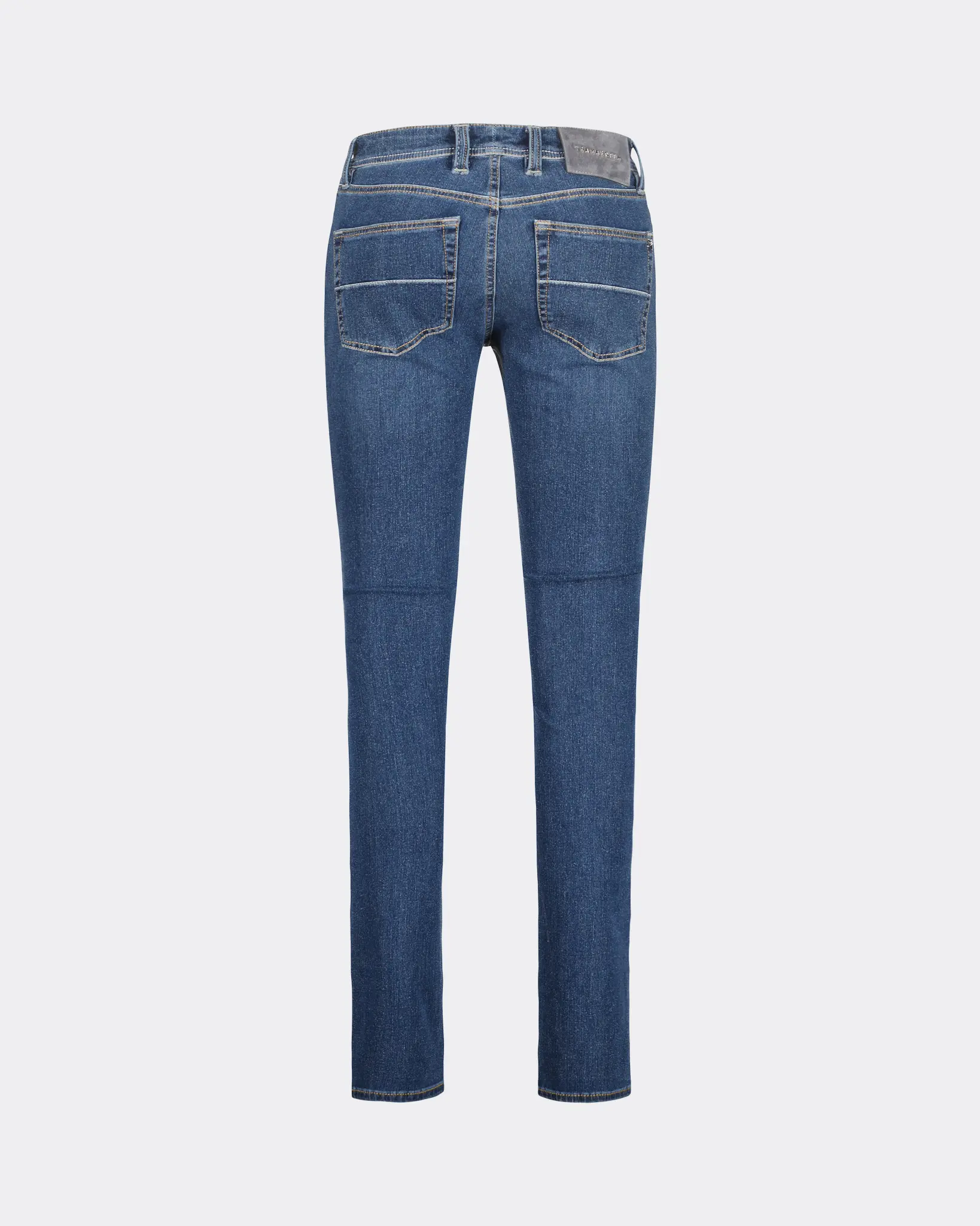 Blauwe Leonardo Zip Jeans van het merk Tramarossa. De tijdloze 5-pocket jeans in Denim Heritage heeft een slim-fit pasvorm en een super stretch.