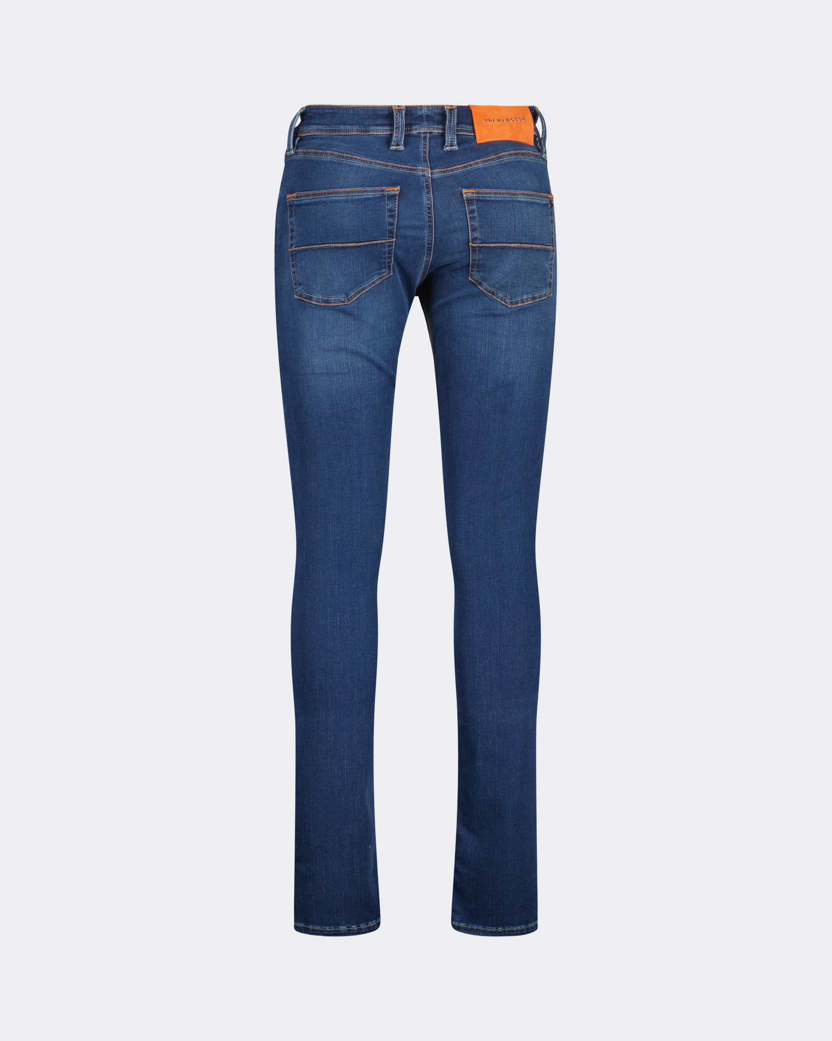 Blauwe ' Leonardo Jeans 2 Years ' van het merk Tramarossa. Tijdloze 5 pocket jeans, met stretch en een slim-fit pasvorm. De jeans kan worden gepersonaliseerd met hun initialen die aan de voorkant van de rechterbroekzak bevestigd worden.
