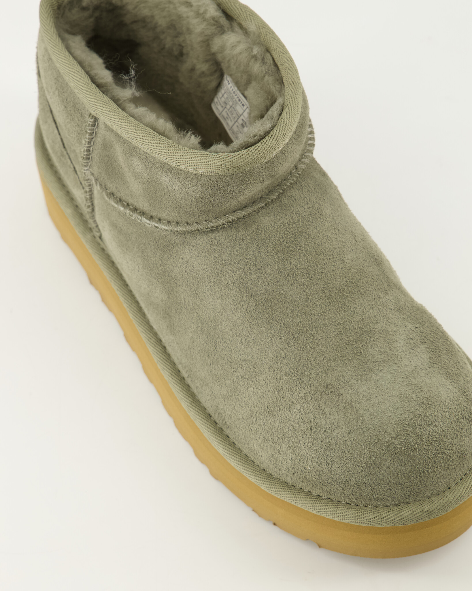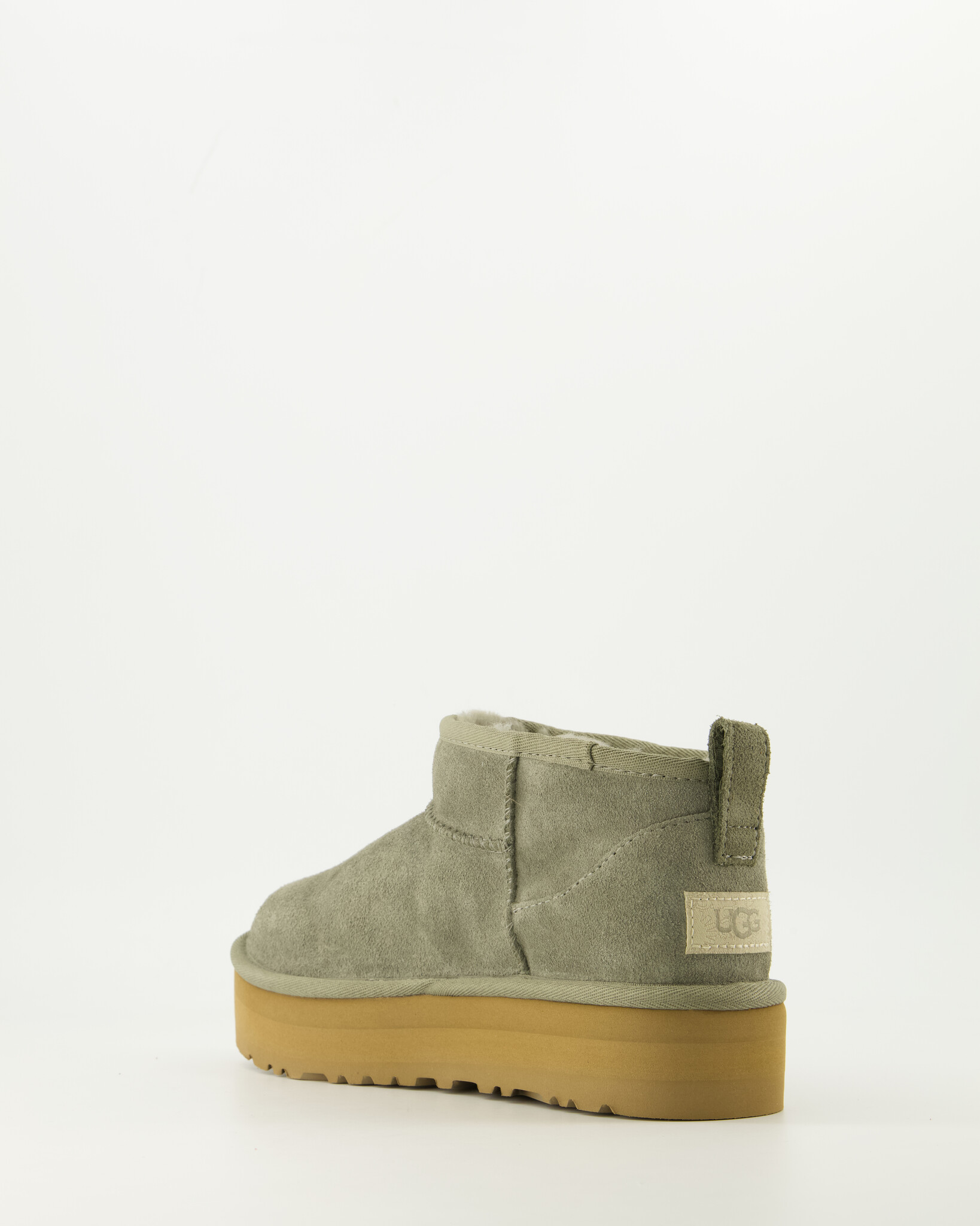 Groene Classic Mini Platform Boots van het merk UGG Junior. Deze Neumel is een nieuwe versie van de tijdloze Chukka, ditmaal in een super opvallende look. Met een nieuwe 3,8 cm hoge plateauzool die je benen langer doet lijken, en gemakkelijker is aan en uit te trekken. De stijl is gemaakt van luxueus suède en gevoerd met onze iconische sheepskin, plus een UGG plush™-inlegzool.