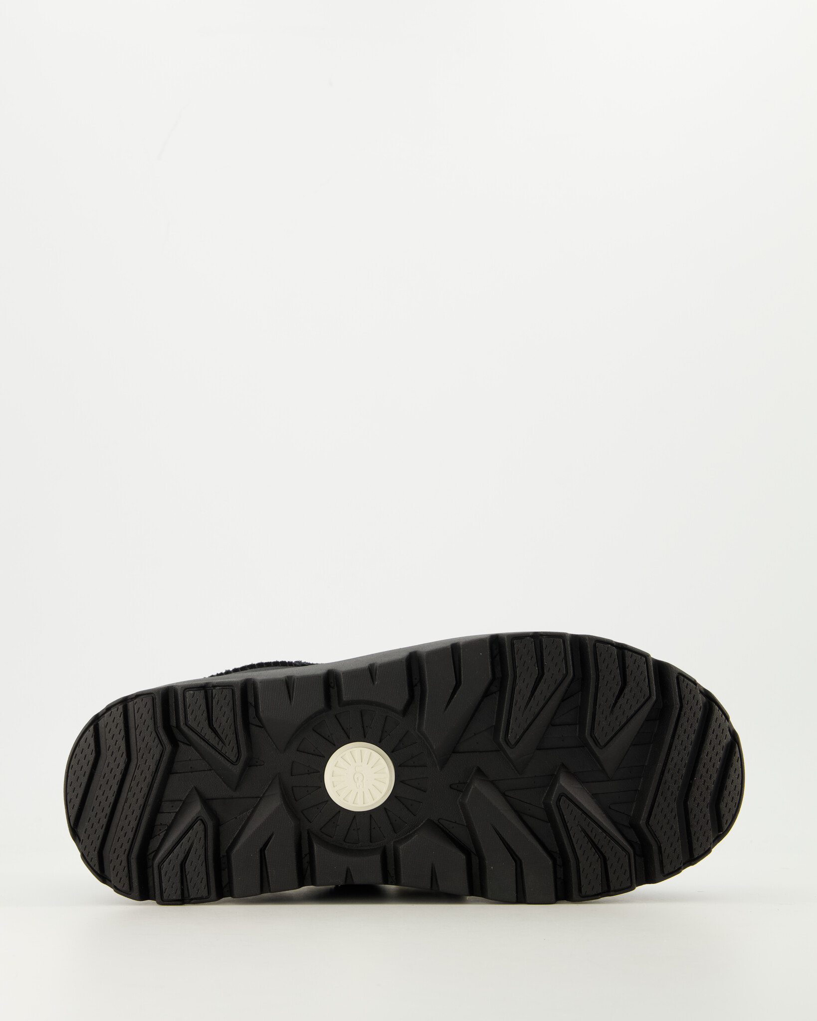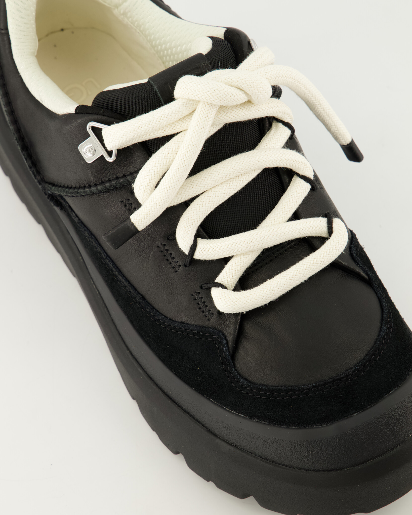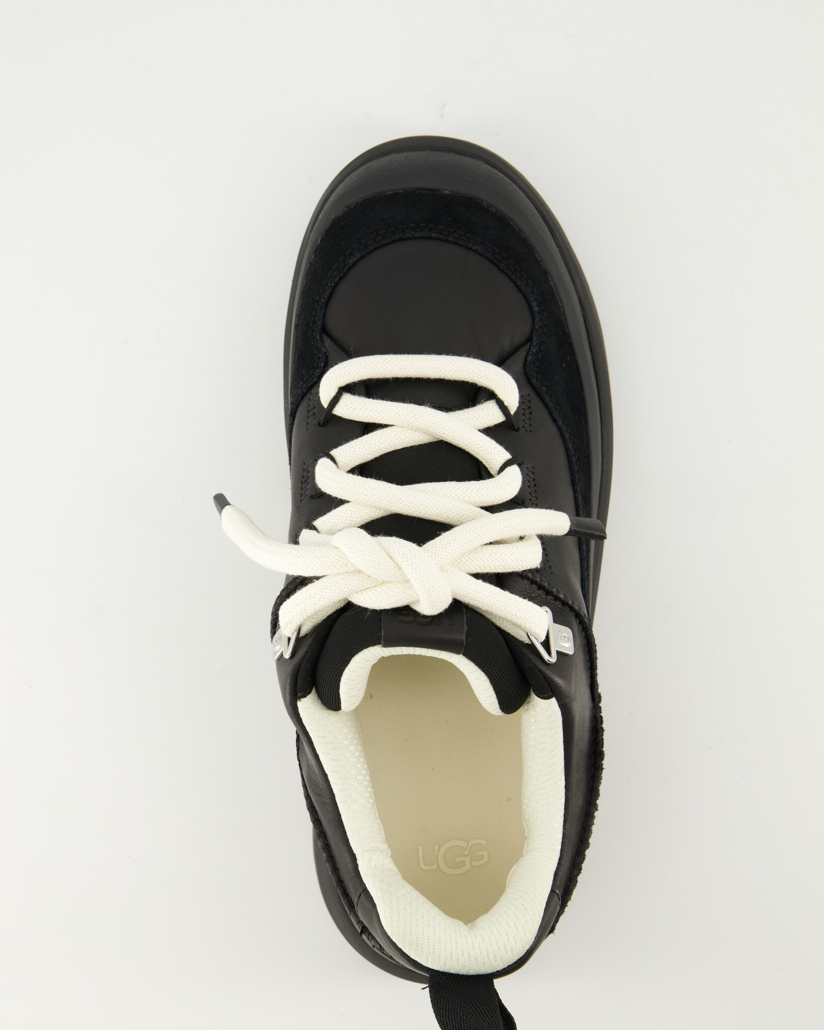 De UGG Heritage Utility Sneaker in het zwart heeft een stoer en modern design. De sneaker is gemaakt van vol-leder met suède details voor een luxe uitstraling. De binnenvoering en inlegzool bevatten gerecycled materiaal, wat bijdraagt aan duurzaamheid. De lichte EVA-zool met Spider Rubber®-noppen zorgt voor goede grip en comfort. Door de volledig zwarte kleur is de schoen makkelijk te combineren met verschillende outfits. Wel vraagt het leren bovenwerk om regelmatig onderhoud. De sneaker is comfortabel, stevig en ideaal voor dagelijks gebruik.
