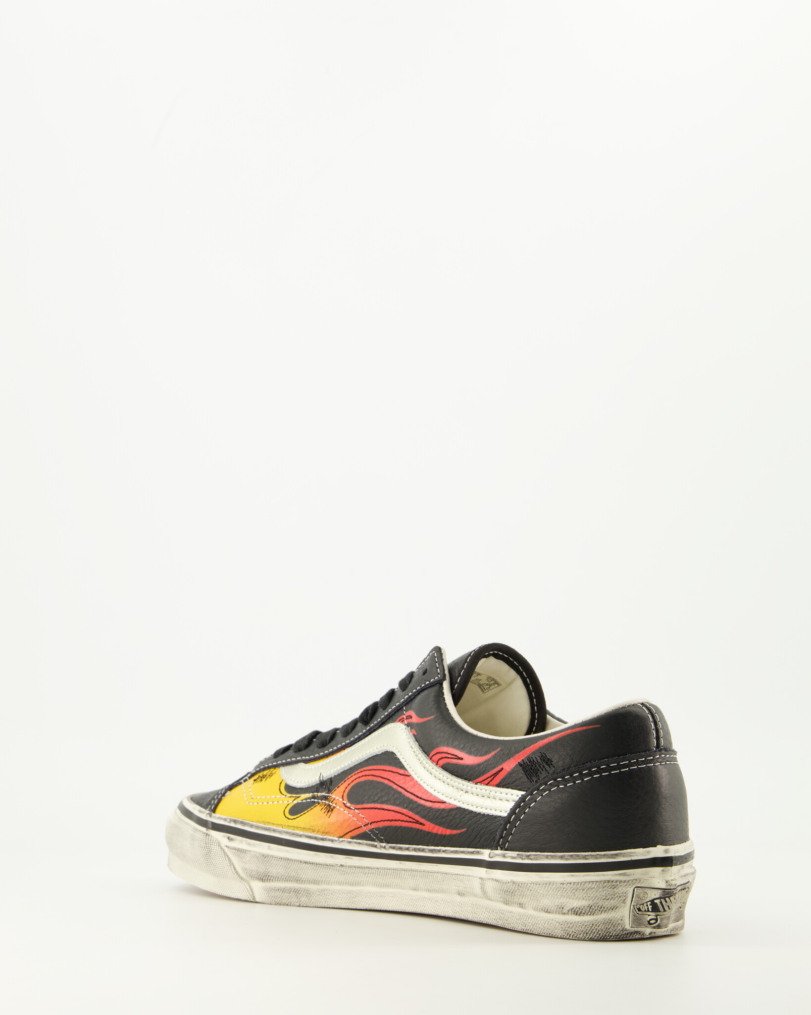 De Vans Old Skool 36 LX ‘Archive Flame Black’ is een premium uitvoering van de iconische skate sneaker. Deze versie combineert een zwarte suède en canvas upper met opvallende flame graphics in rood- en geeltinten voor een echte retro streetwear look. De schoen is afgewerkt met de kenmerkende witte side stripe en een stevige rubberen zool voor comfort en grip. Dankzij de LX-afwerking profiteer je van hoogwaardige materialen en een betere afwerking dan de standaard Old Skool.