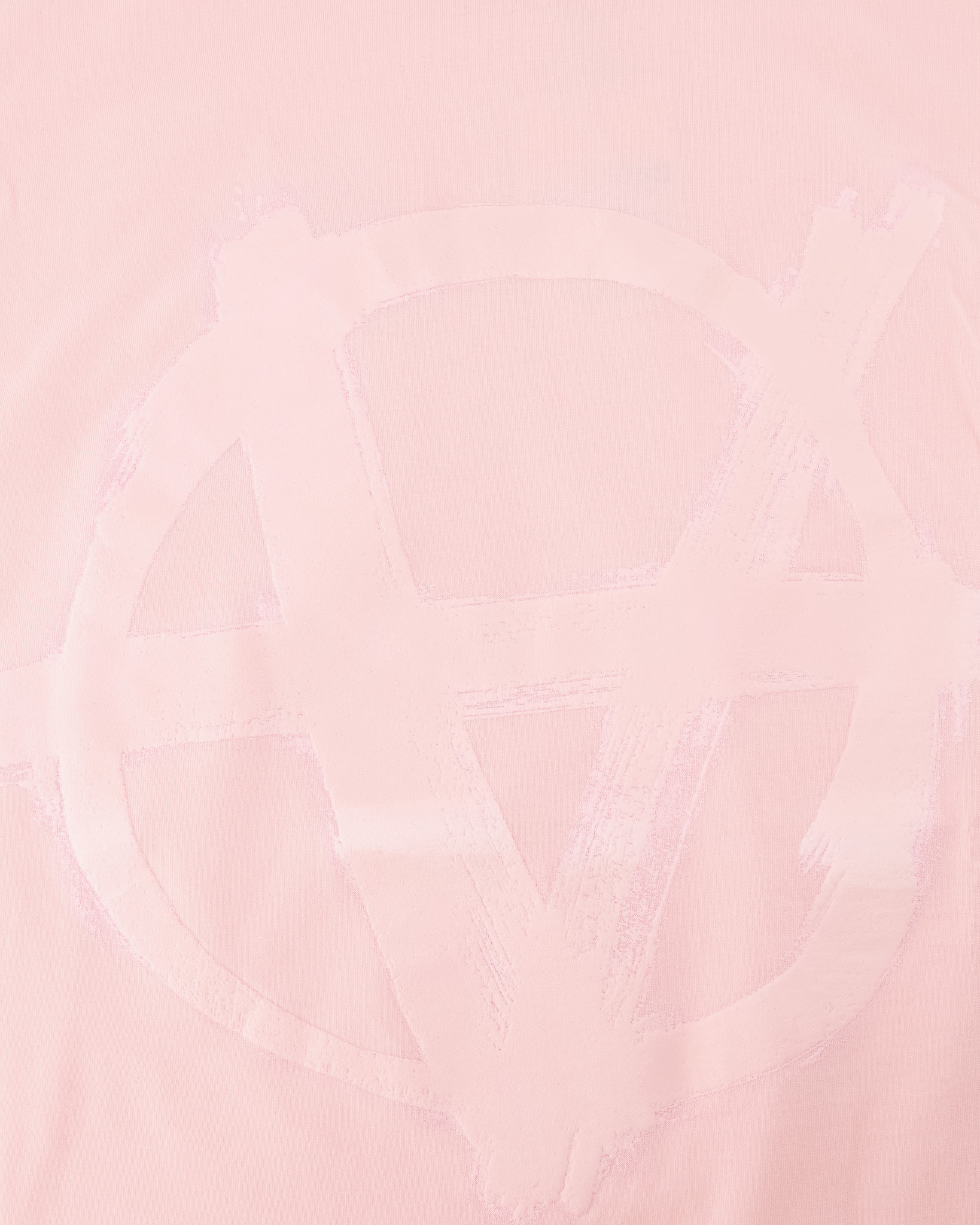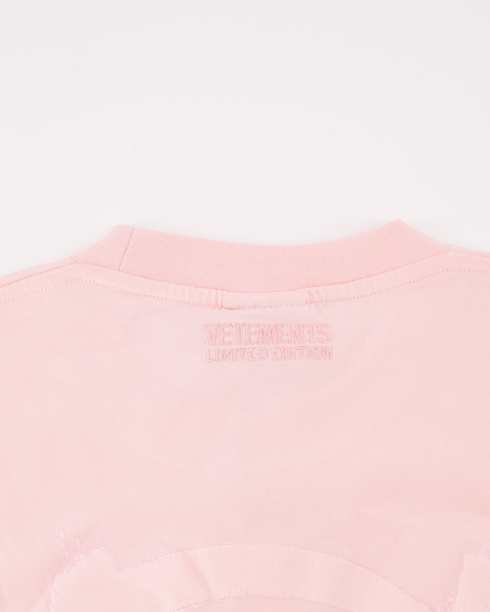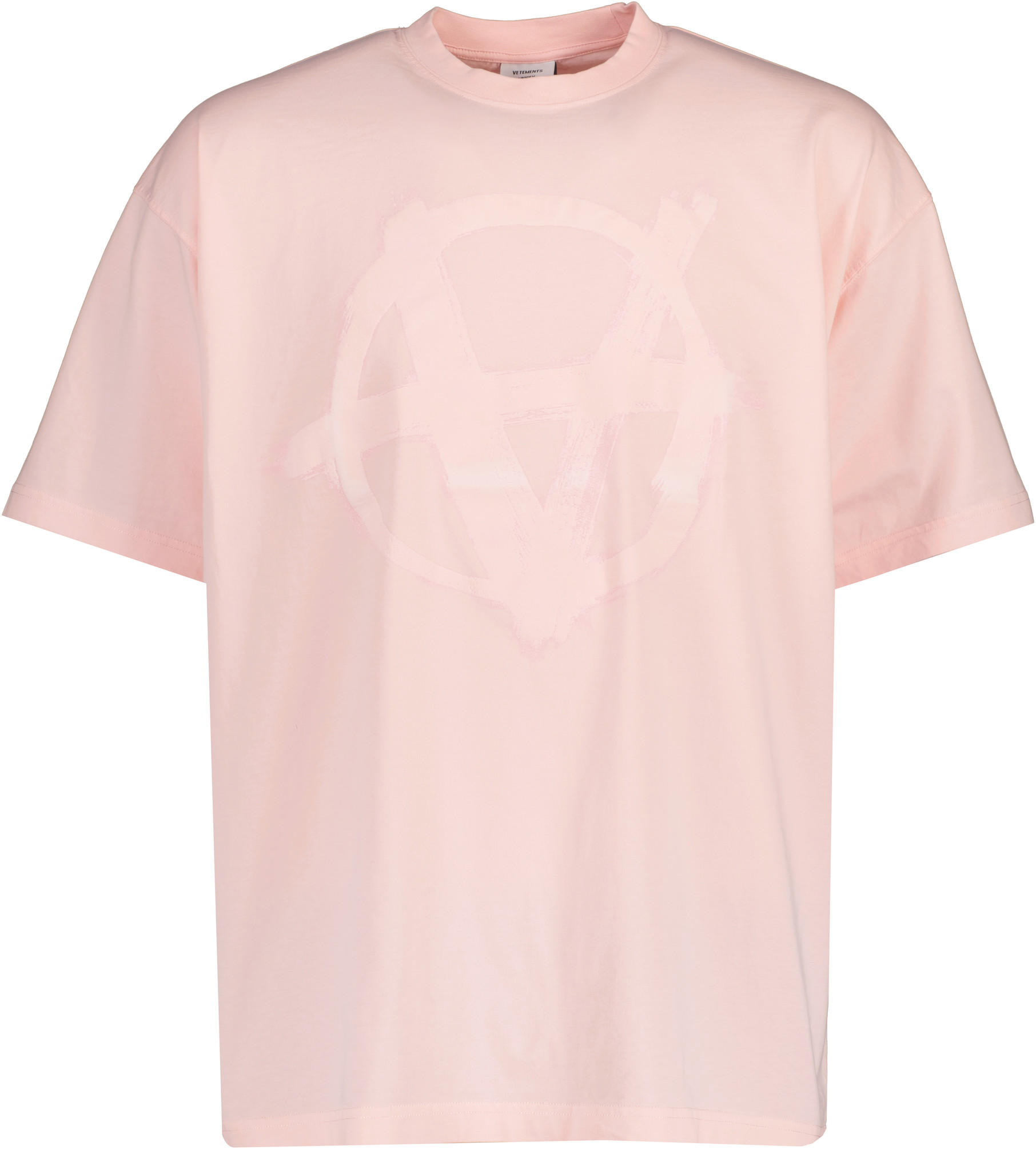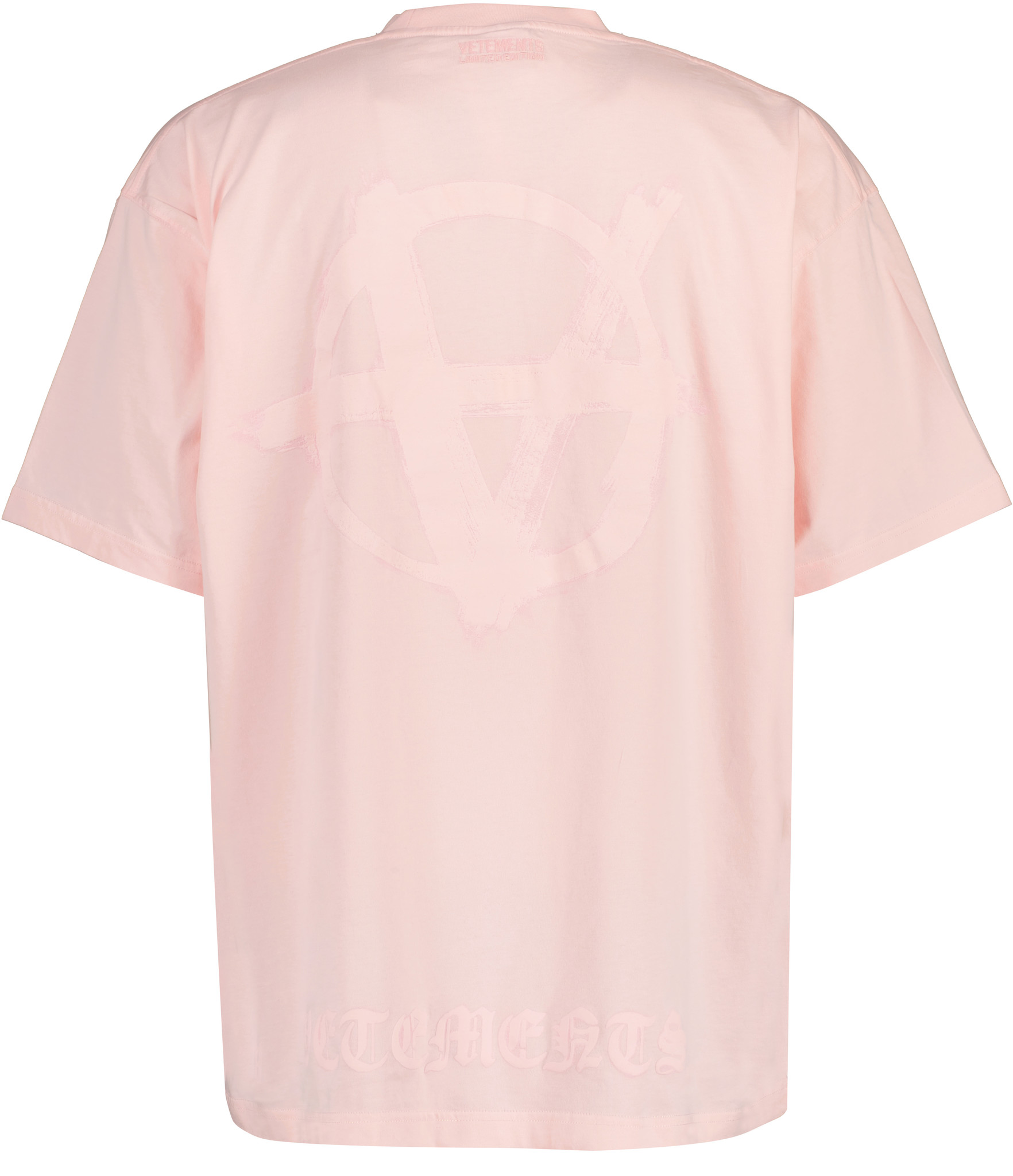 Roze Double Anarchy Logo T-shirt van het merk Vetements. Het oversized t-shirt heeft een ronde hals, korte mouwen en een print op de borst en rug.