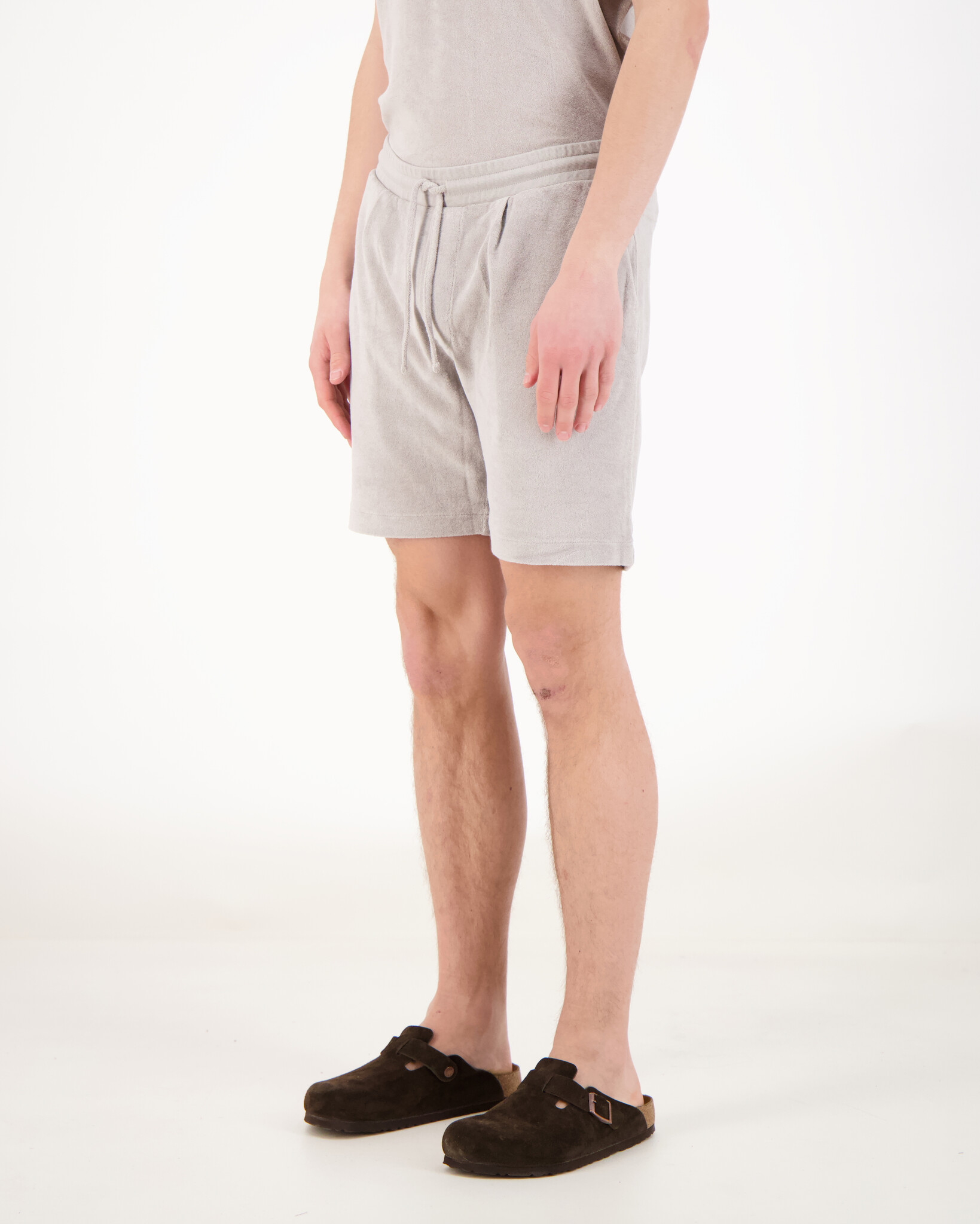 Grijze Baxter Toweling Pleated Short van het merk Wahts. Toweling/badstof voelt zacht en absorberend aan — vergelijkbaar met badhanddoekmateriaal maar dan als kleding. De shorts hebben een elastische tailleband met een trekkoord, en zijn ideaal voor ontspannen dagen aan het strand, bij het zwembad of in de stad.