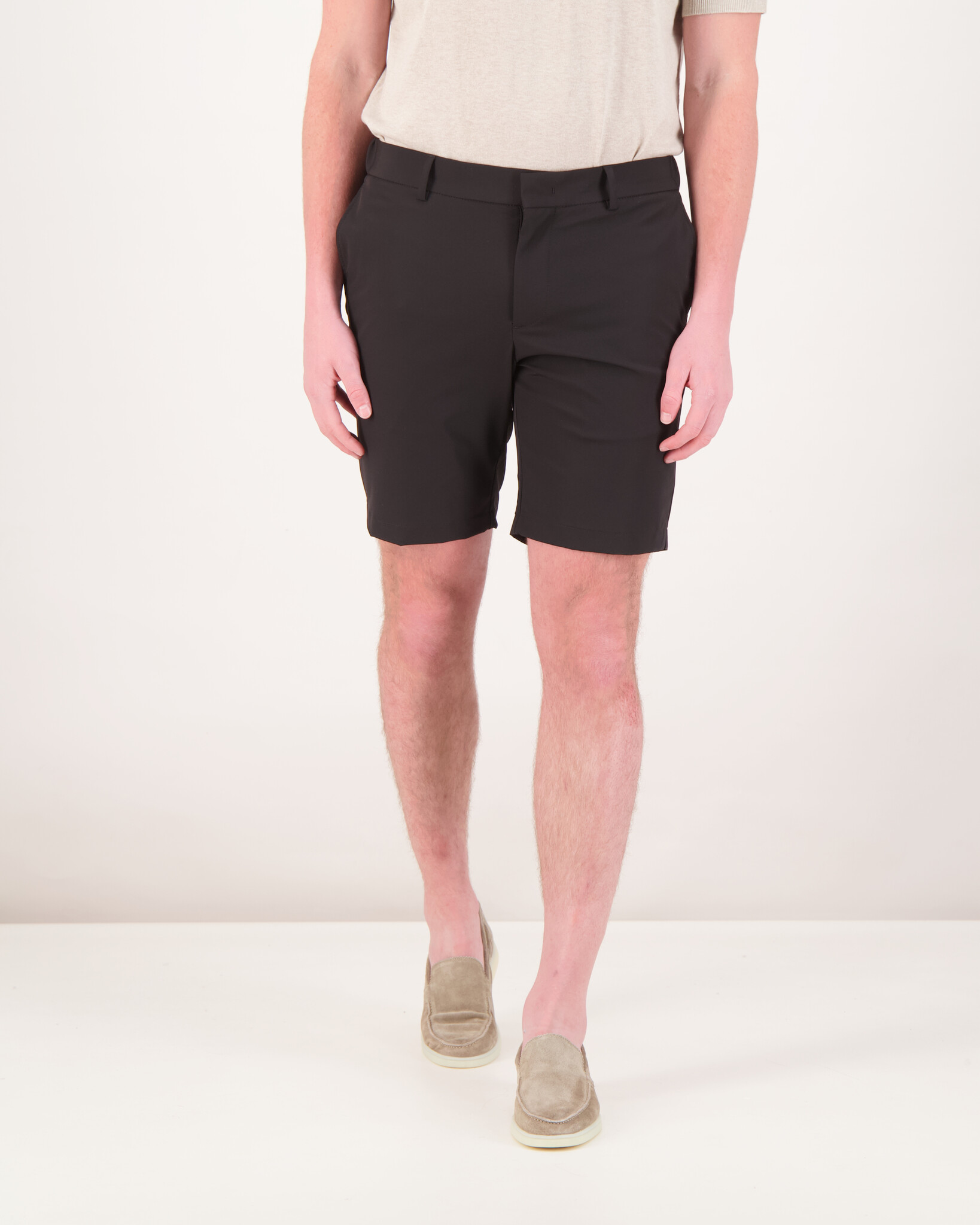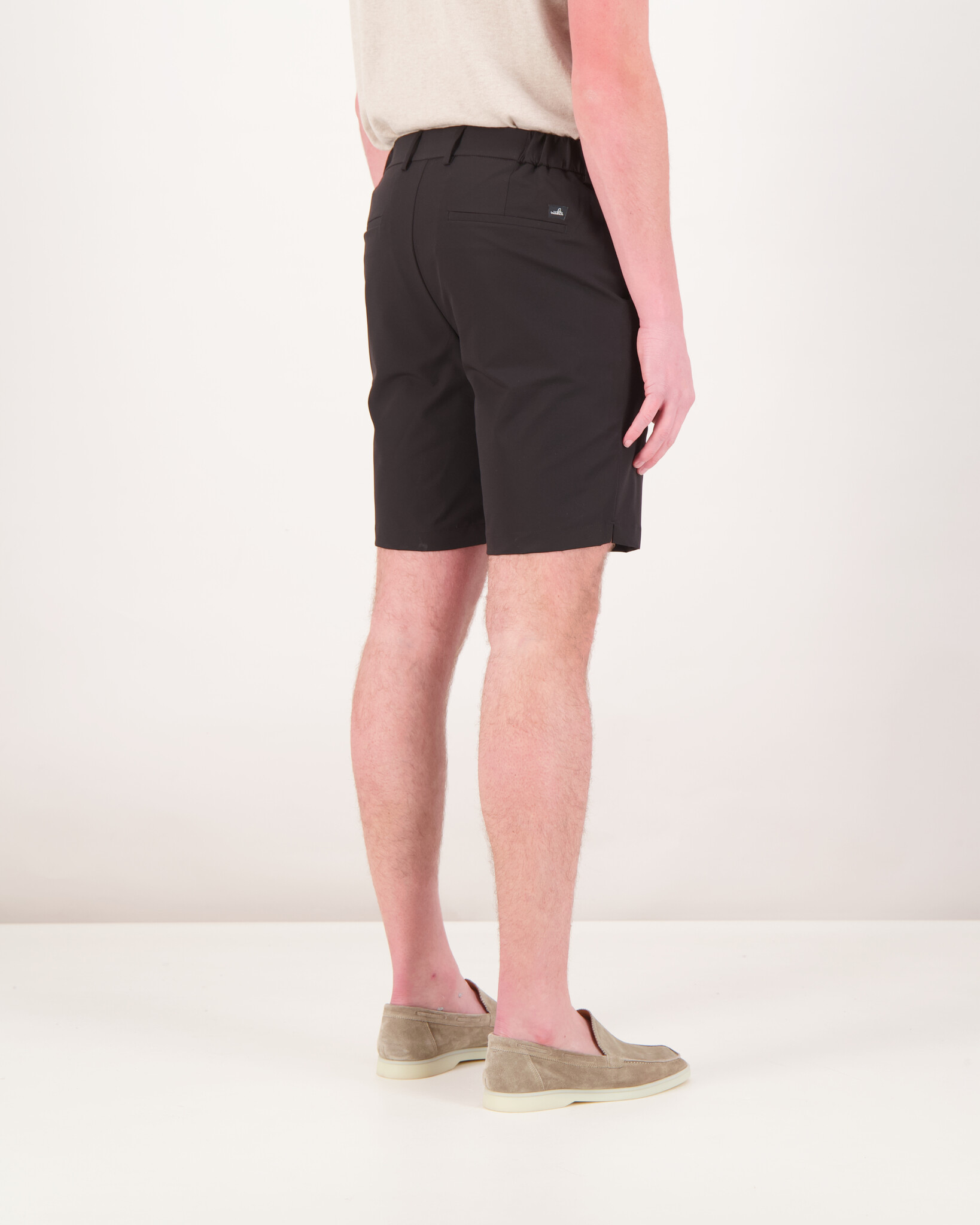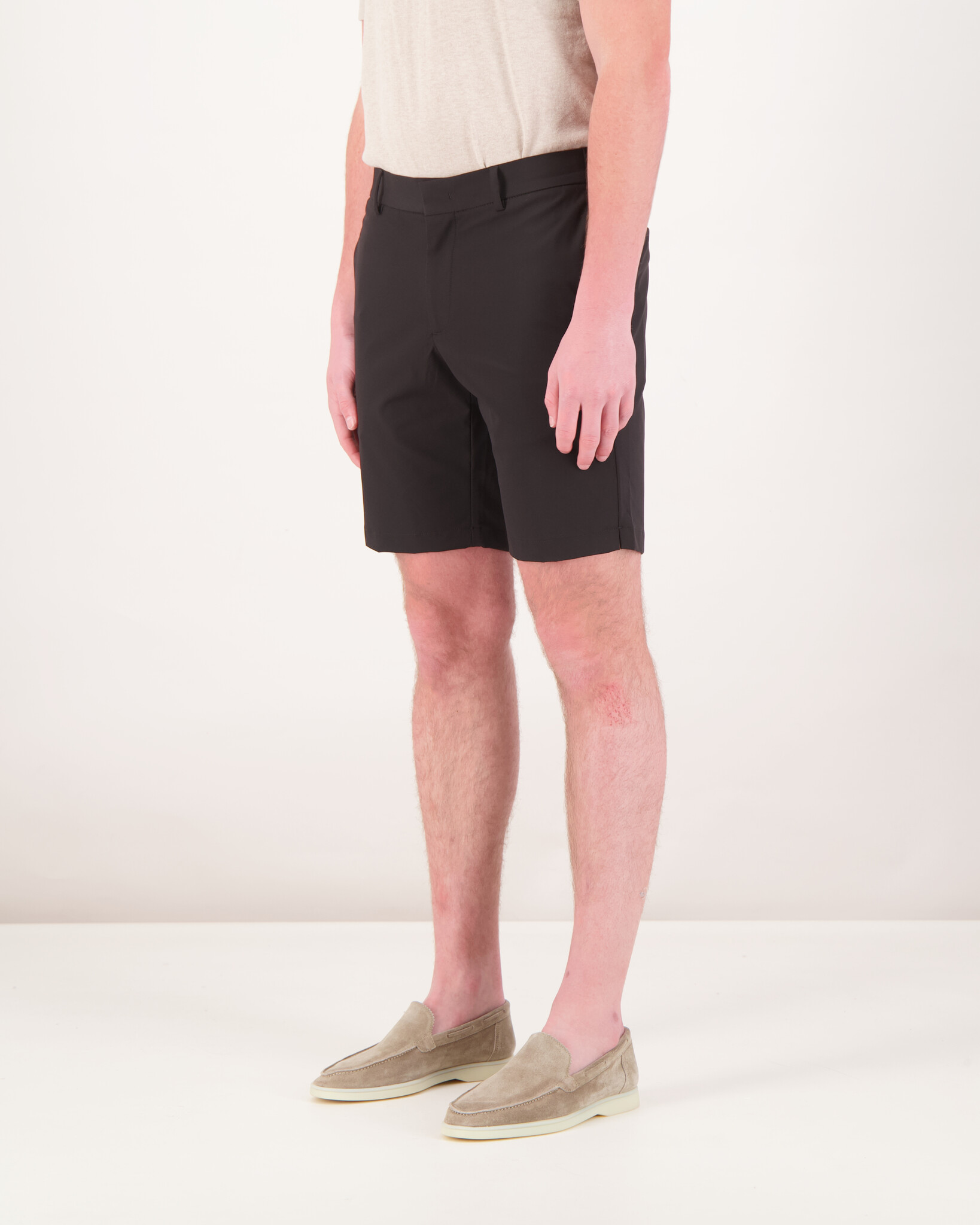 Zwarte Fillin Tech Stretch short van het merk wahts. Slim fit tech bermuda gemaakt van een Italiaanse stretchstof die ademend en waterafstotend is. Draag ze smart of casual: dankzij de elegante pasvorm en de uiterst comfortabele stof wordt dit je favoriete broek voor elke gelegenheid.
