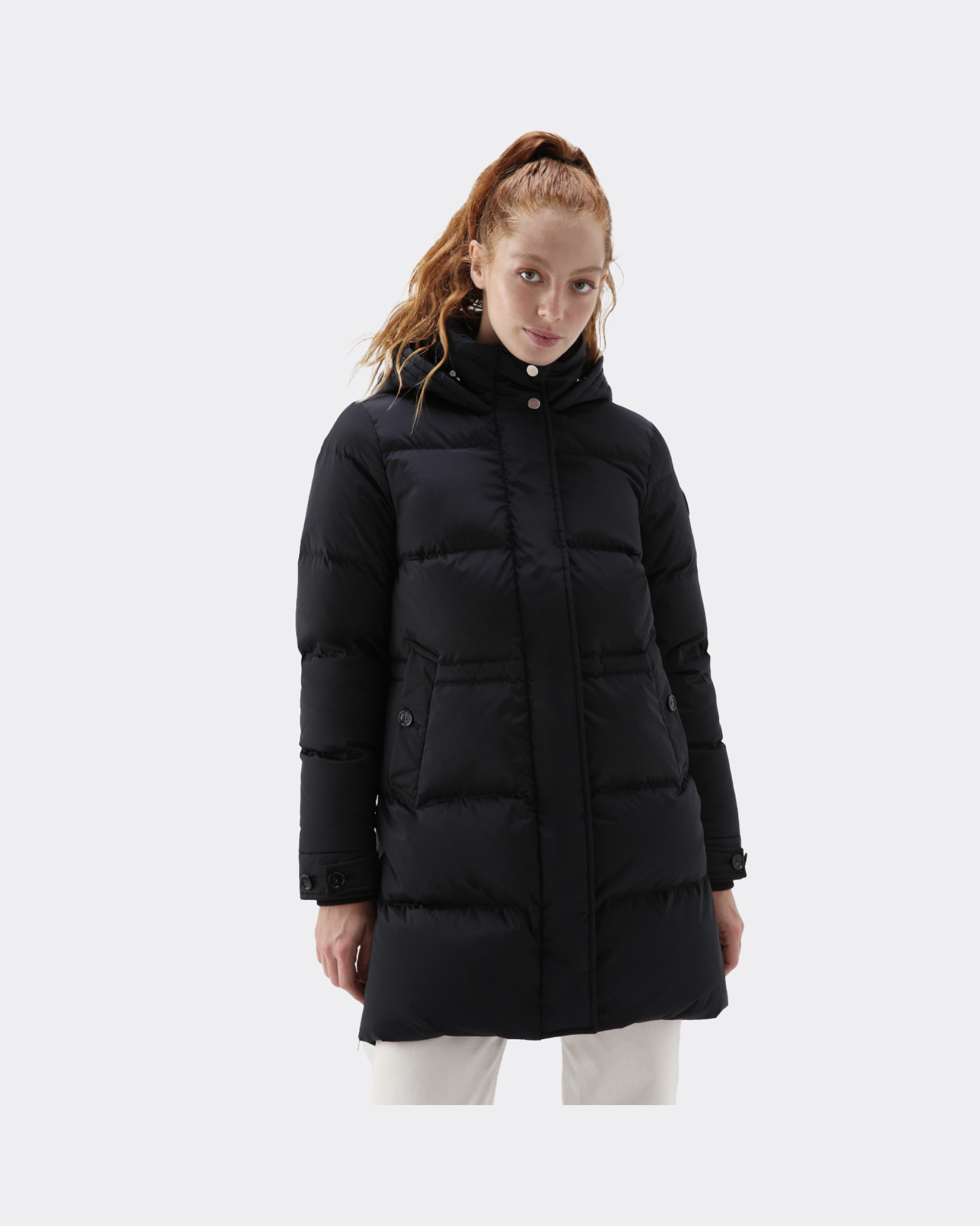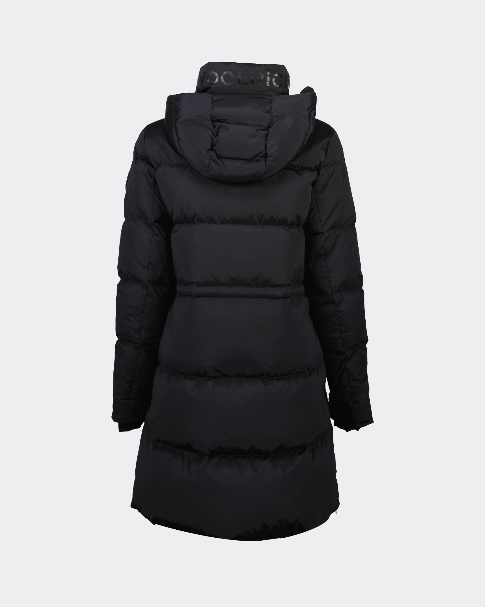 Zwart Alsea Puffy Parka van het merk Woolrich. De jas heeft een capuchon, twee knoopzakken en het Woolrich logo op de linkermouw.