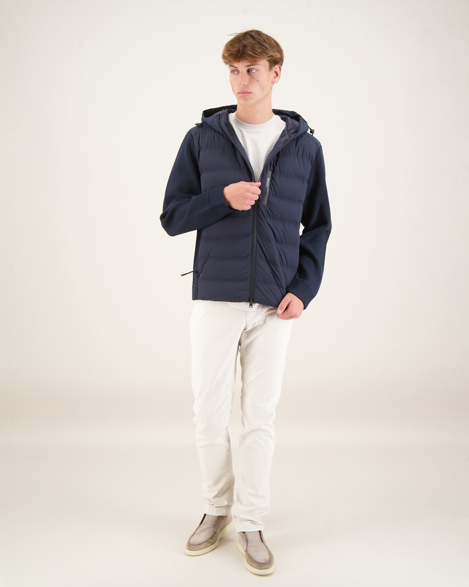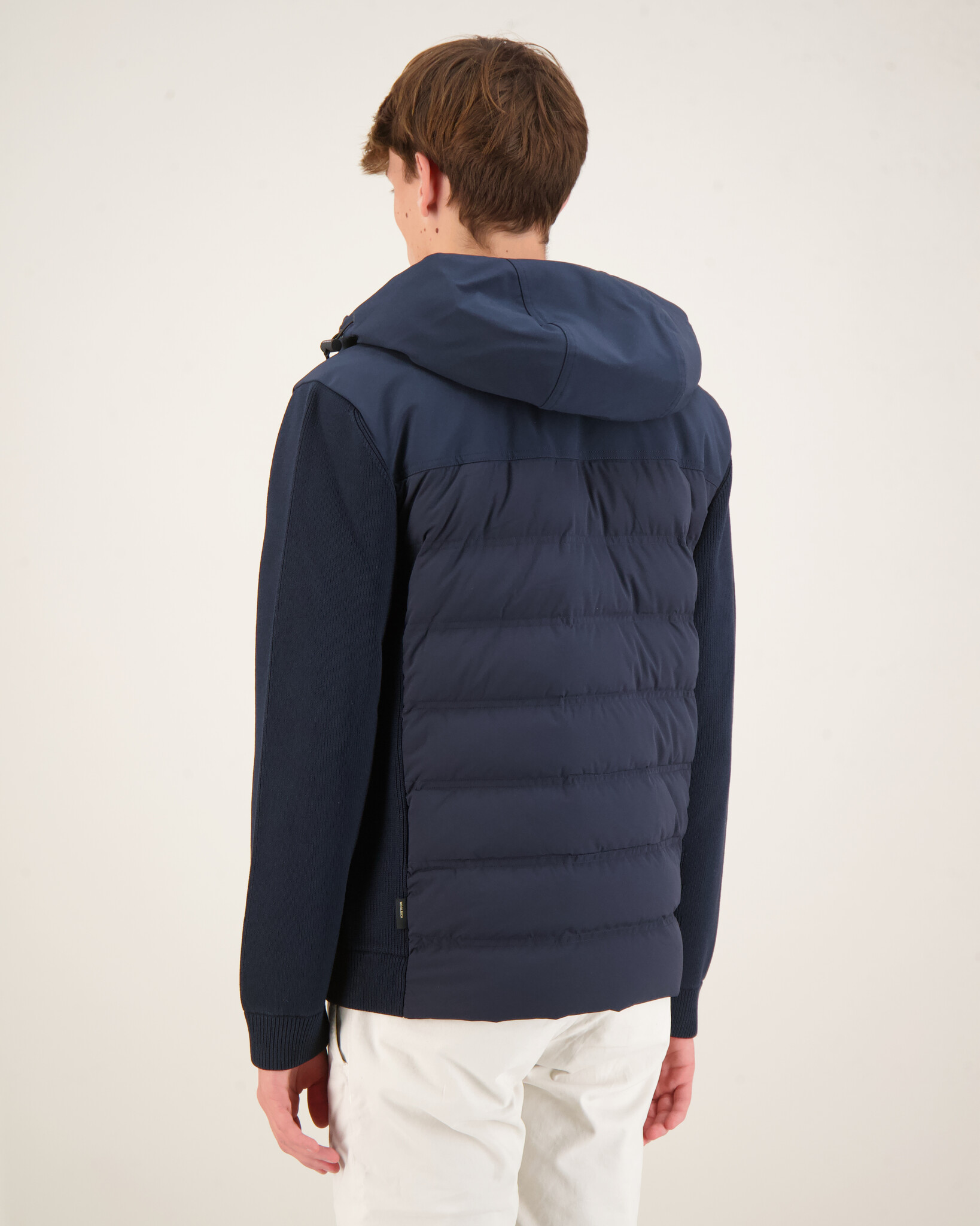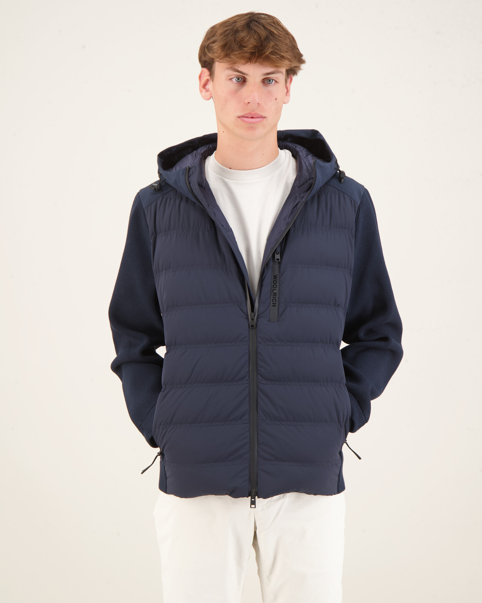 Blauwe Bering Hybrid Jacket van het merk Woolrich. Een praktisch en omhullend model, perfect tijdens het winterseizoen. Dit hybride Bering-jack, gemaakt van elastisch nylon, is water- en windbestendig en is gevoerd met eendendons. Het wordt gekenmerkt door een matte afwerking en een horizontale wattering. De verstelbare capuchon en de schouderlijn zijn van waterdichte Softshell-stof, terwijl de geribbelde mouwen en zijkanten van viscosemix zijn gemaakt. Met hoge kraag, sluiting met tweezijdige rits en geribbelde zijkant. De borstzak, twee zijzakken en de binnenzak zijn allen voorzien van rits en maken het kledingstuk zeer praktisch.
