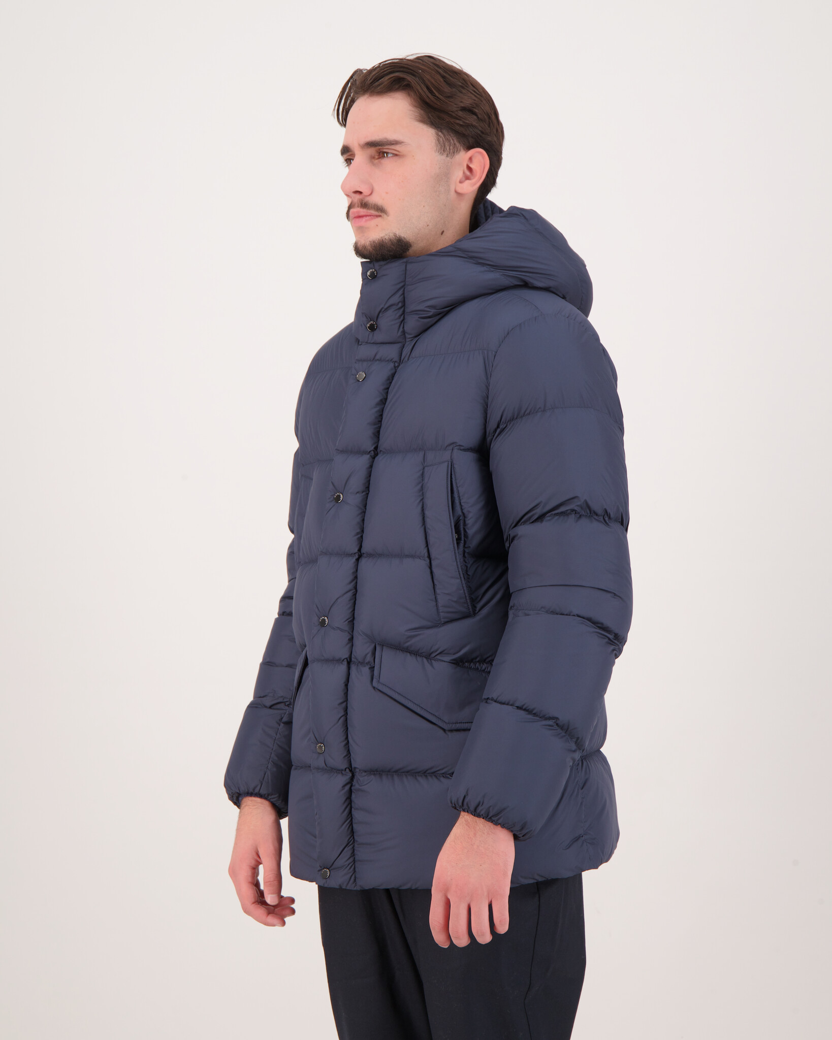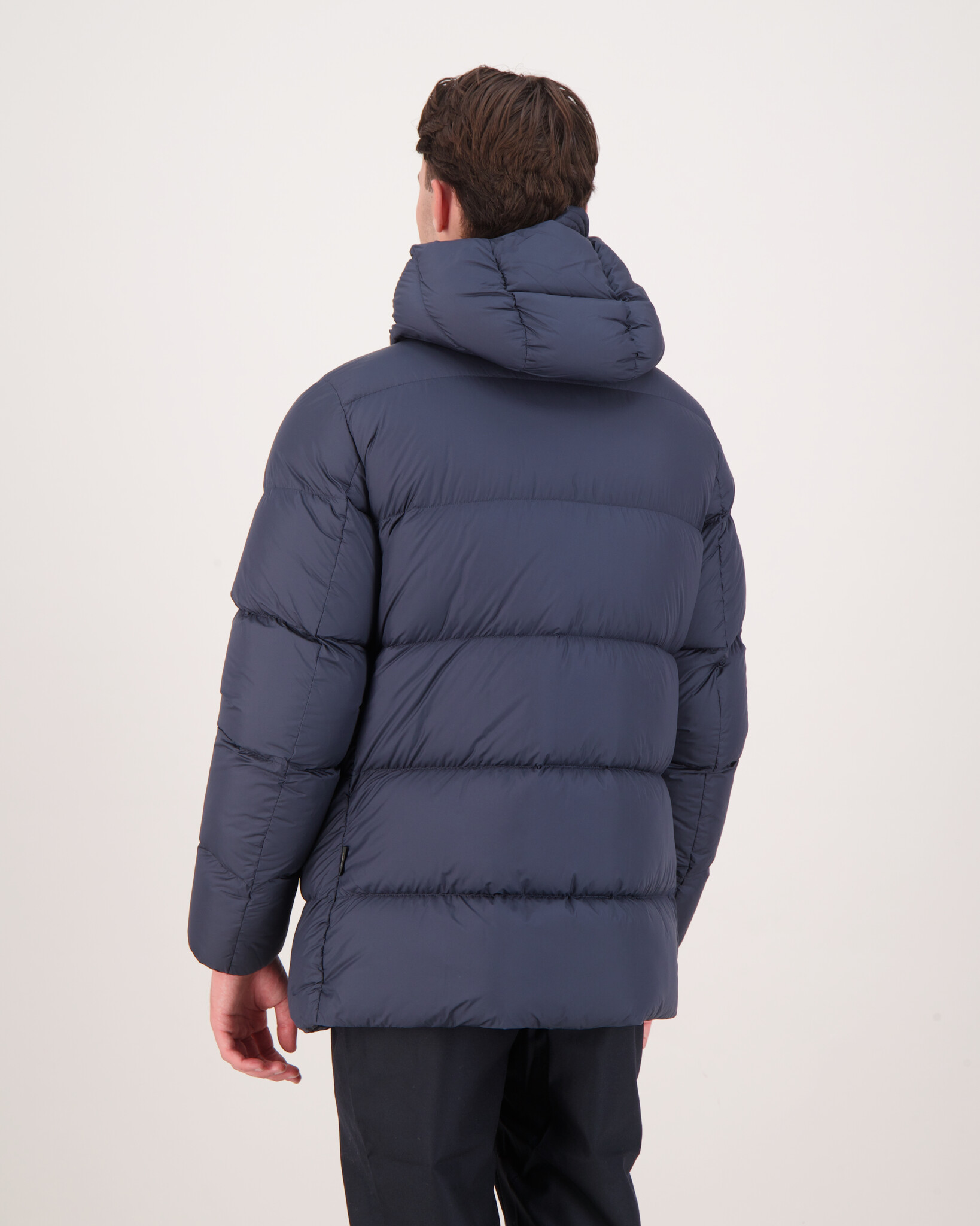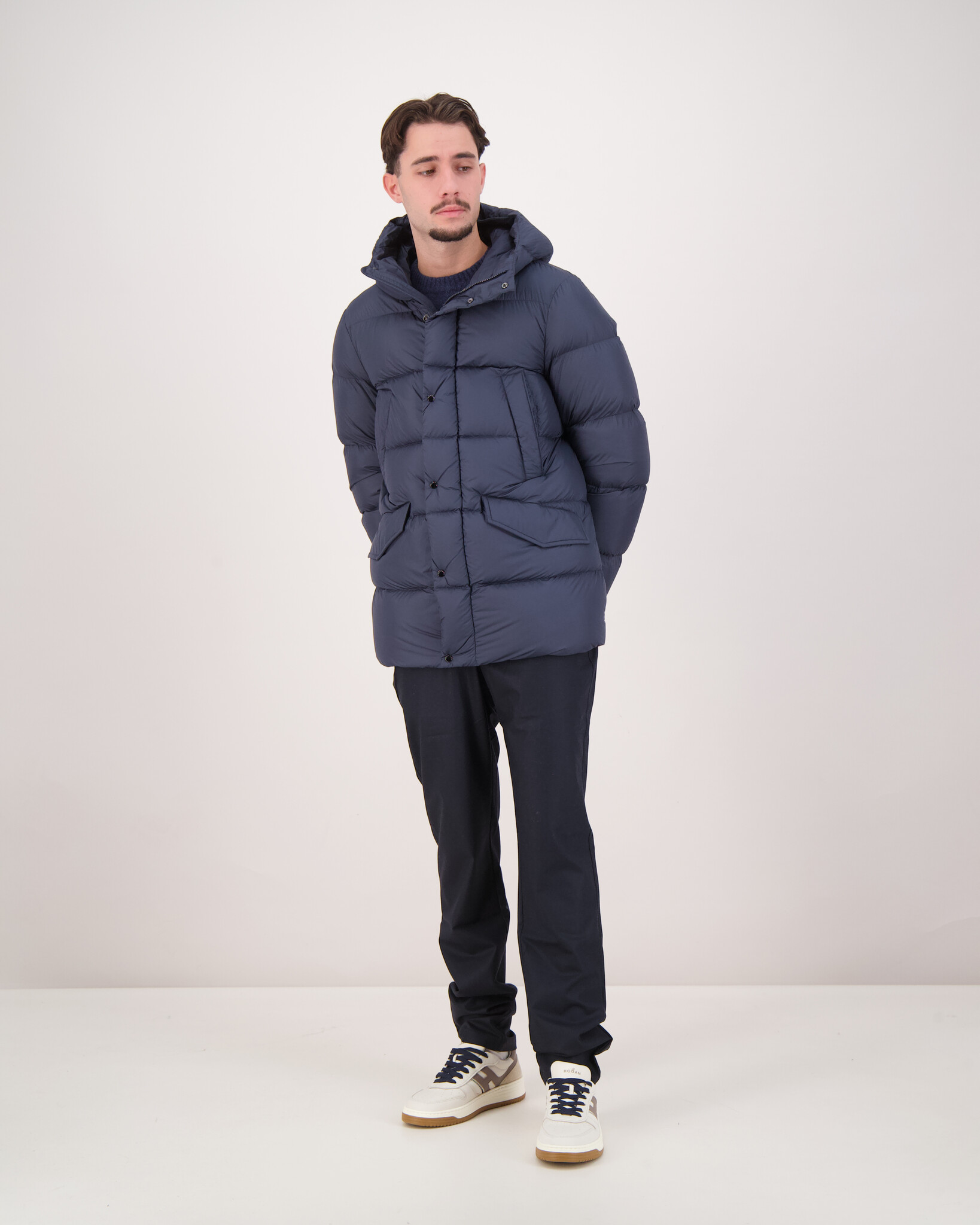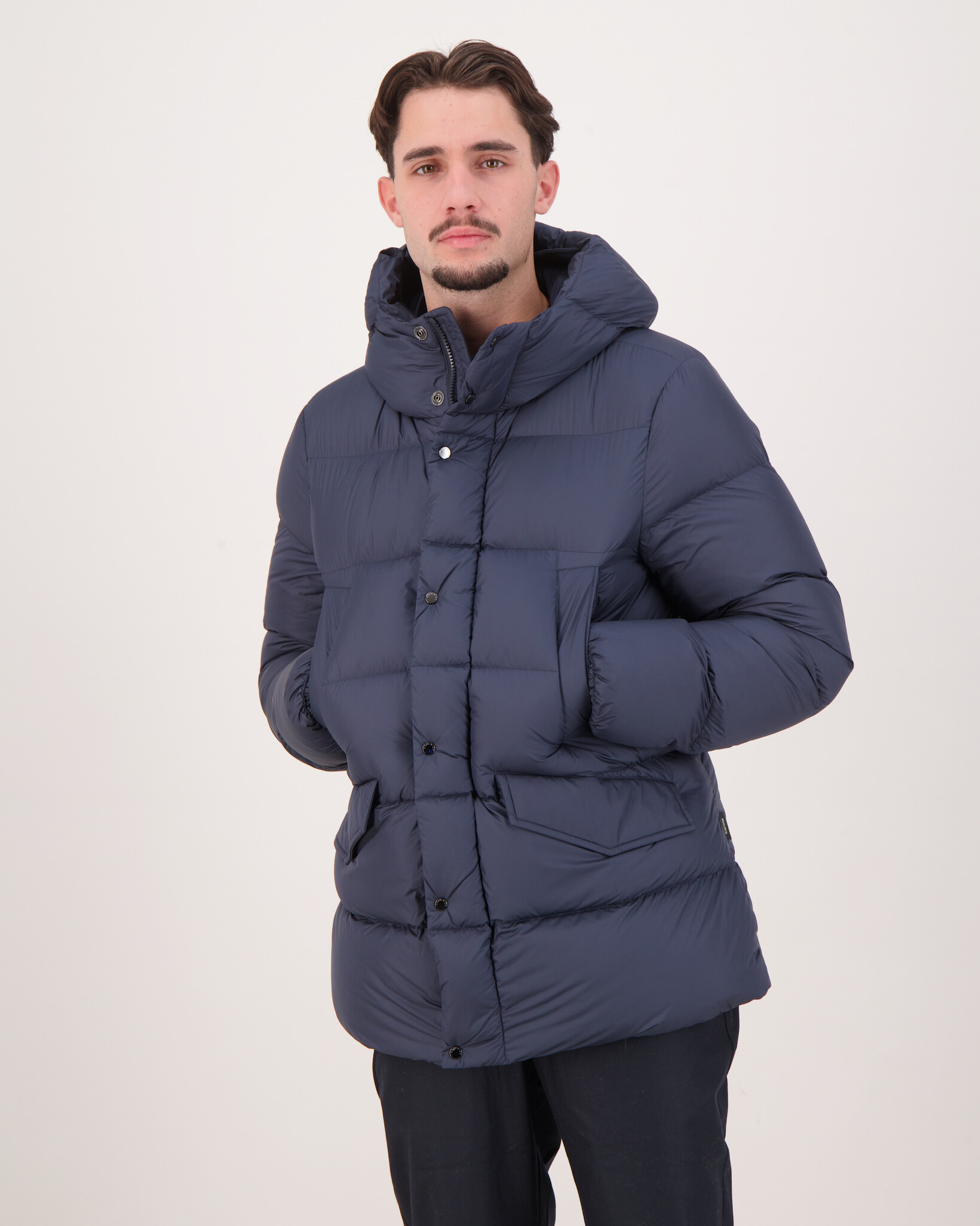 Blauwe Cloud Davis Parka Jas van het merk Woolrich. Deze versie van de jas bevat geen bont. De parka heeft een Rits- en knoopsluiting, op gestikten zakken en handwarmer zakken. In de iconische Woolrich-stof van 60% katoen en 40% nylon met een speciale Teflon-laag om je te beschermen tegen sneeuw, regen en wind, zodat je lekker droog blijft. Met een vulling van 90% eendendons en 10% veren.
