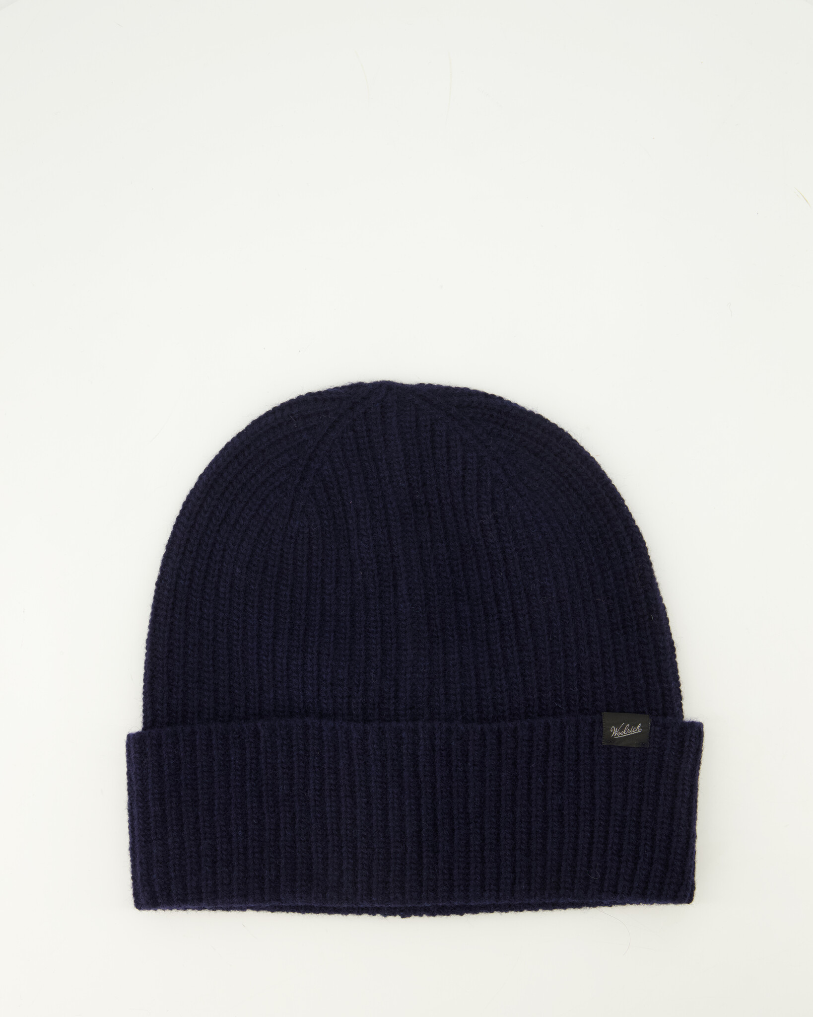 Blauwe Knitted Ribbed Beanie van het merk Woolrich. Deze muts heeft een omslag en aan de rand het bekende Woolrich logo.