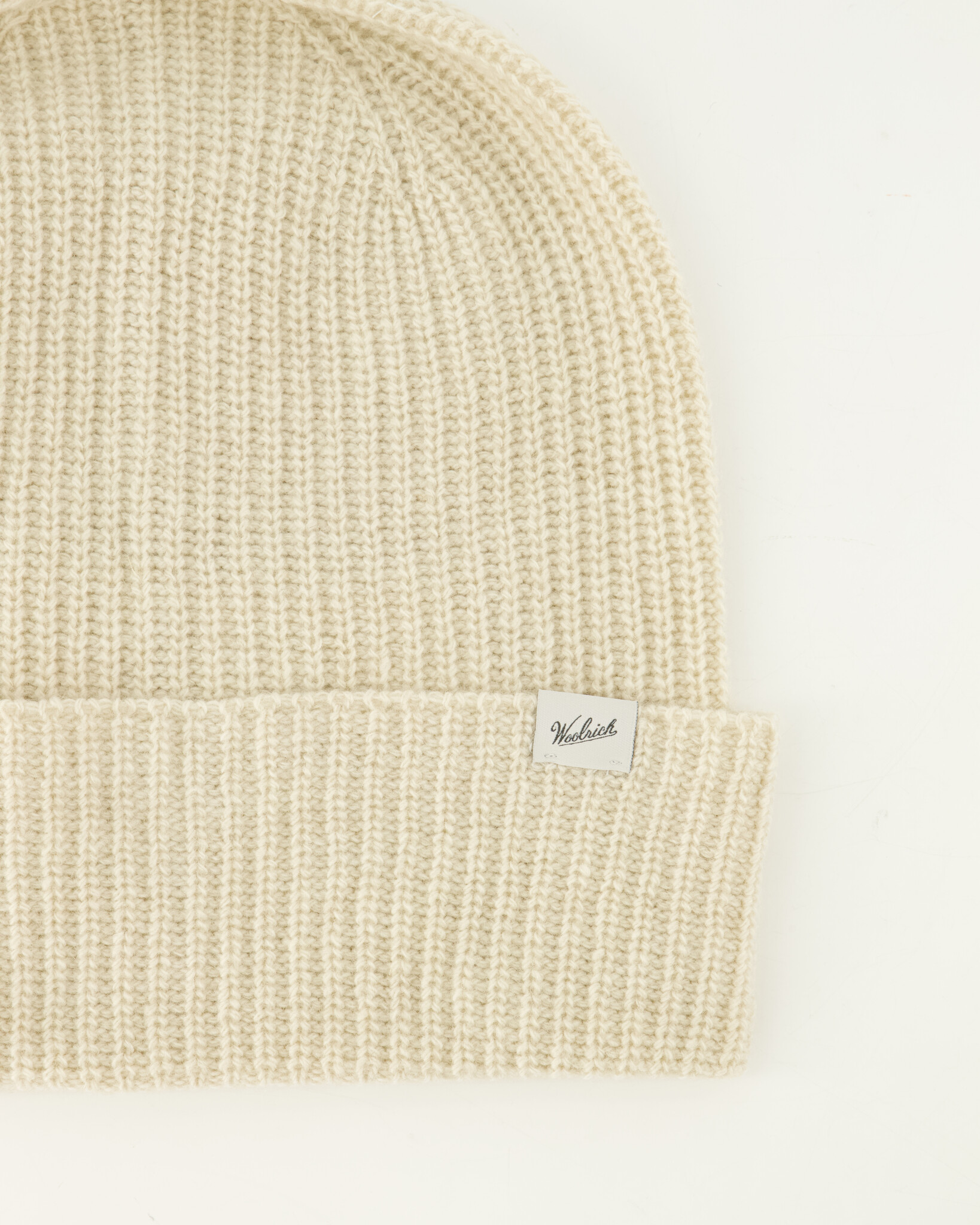 Creme Knitted Ribbed Beanie van het merk Woolrich. Deze muts heeft een omslag en aan de rand het bekende Woolrich logo.