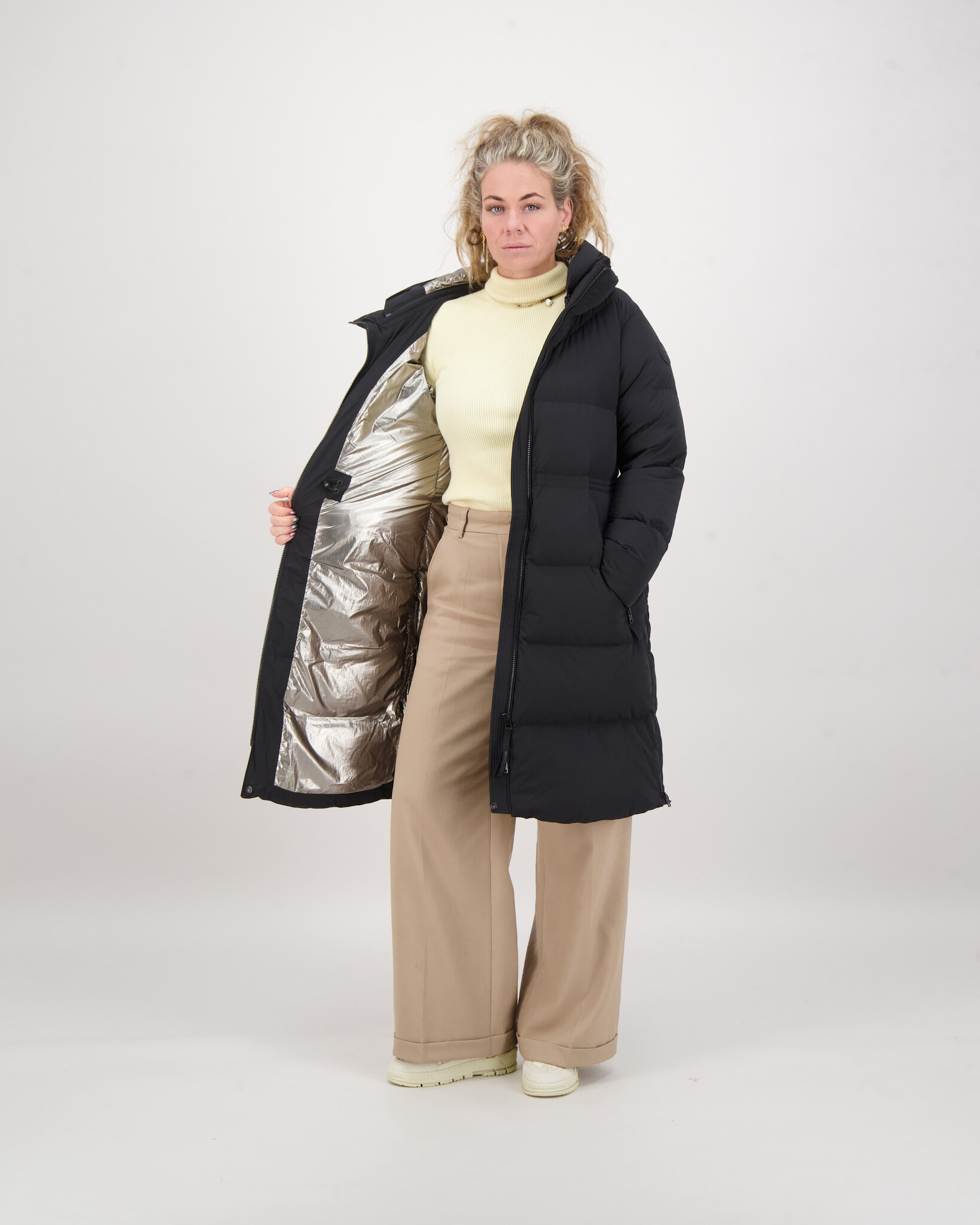 •Een kinbescherming van tricot stof wanneer de jas sluit.