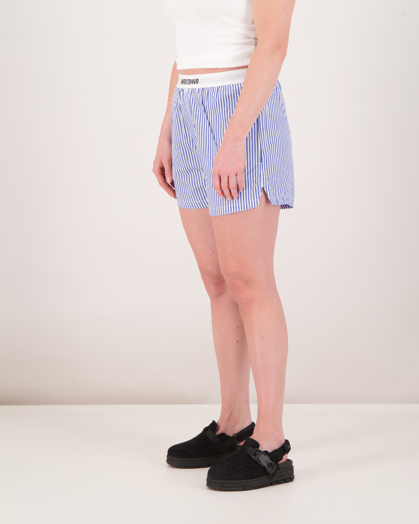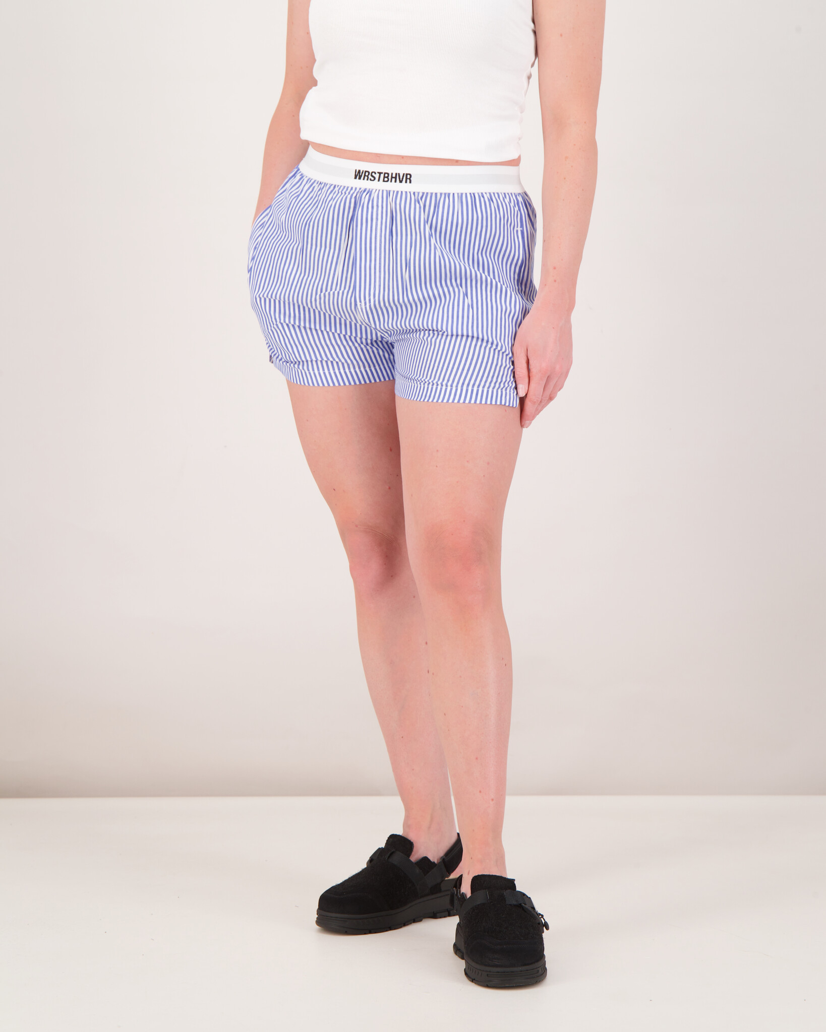 Het Prue Boxershort van Wrstbhvr is blauw met een streepprint en heeft een elastische tailleband. Het short is gemaakt van 100% katoen en de band heeft het logo erop.